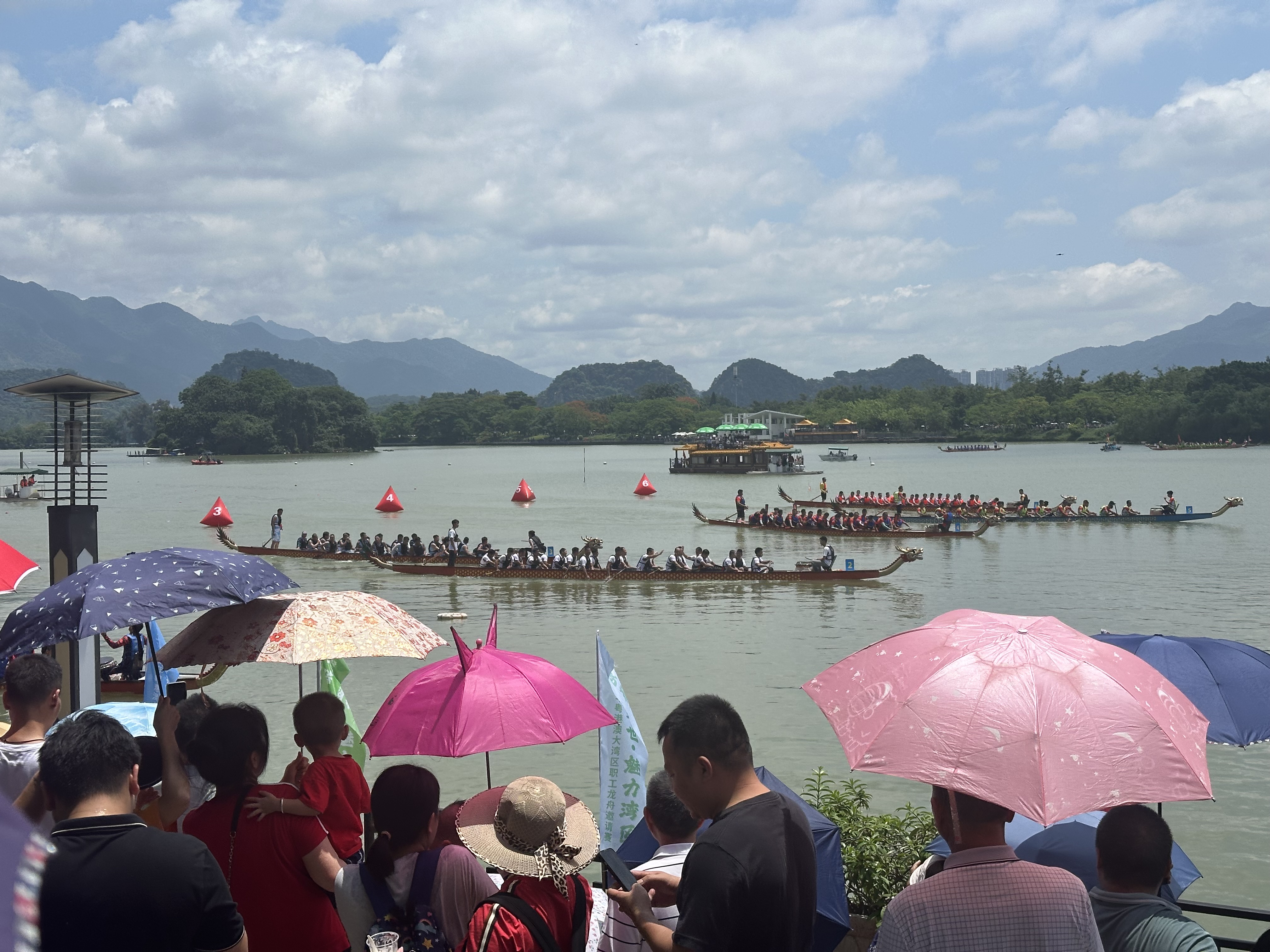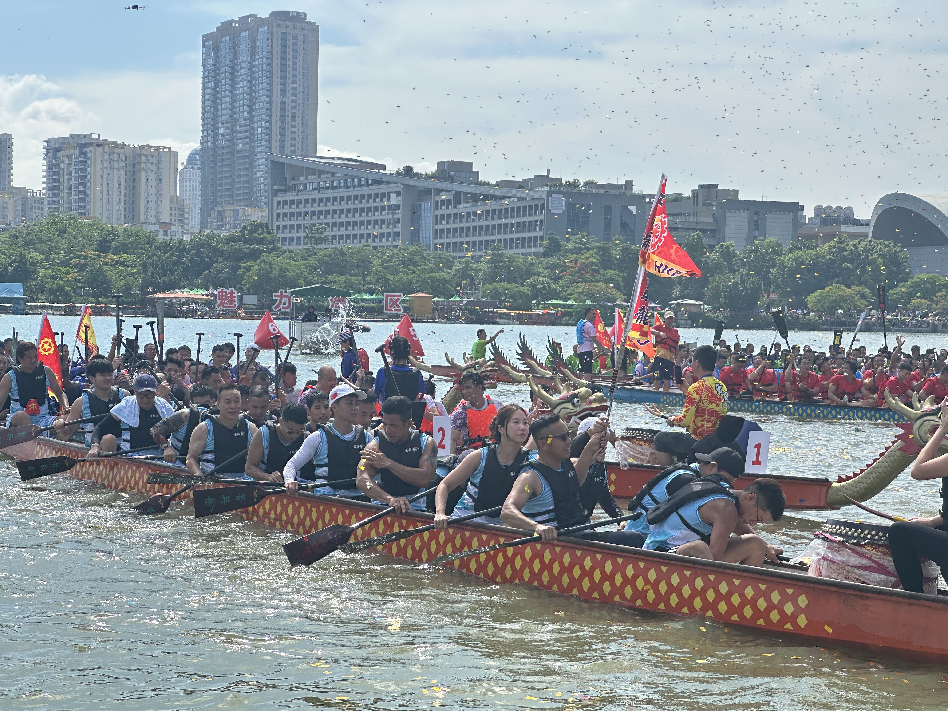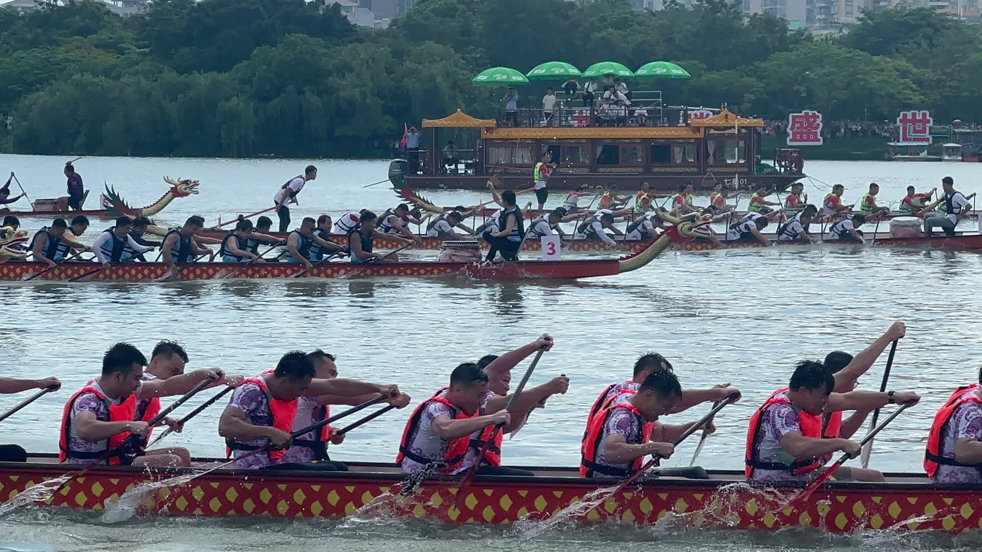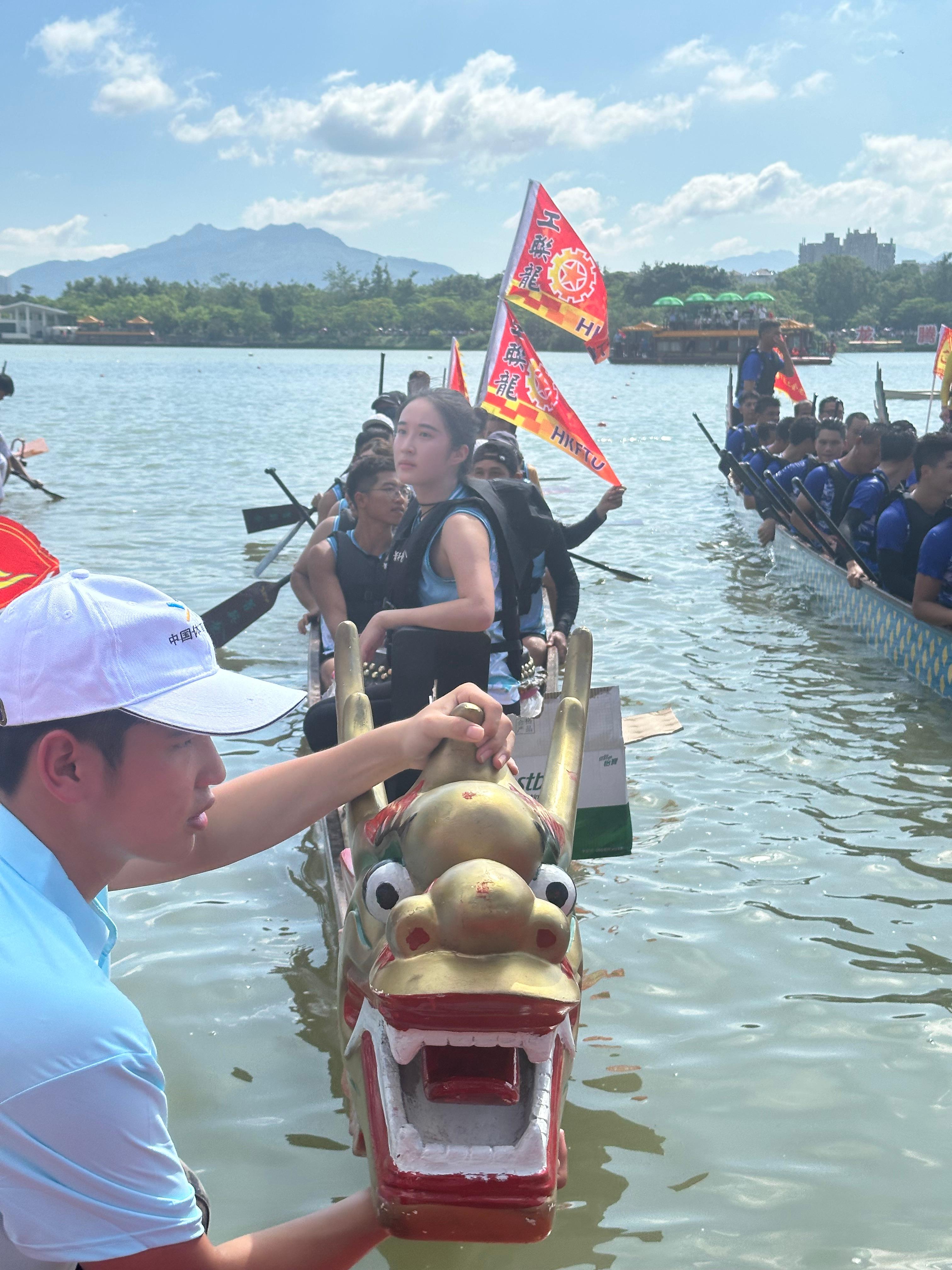 咚咚咚咚……一連串急促的鼓點在星湖響起,一條條龍舟破水而出、極速穿梭,沿着500米的賽道,各龍舟隊伍奮力揮槳、劈波斬浪,河面上鼓聲陣陣。每艘龍舟似蛟龍般,在水面上飛馳而出。經過為期兩天的多輪角逐,香港隊衝進決賽組,且最終獲得男子500米6強、男子200米項目5強的佳績。