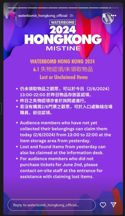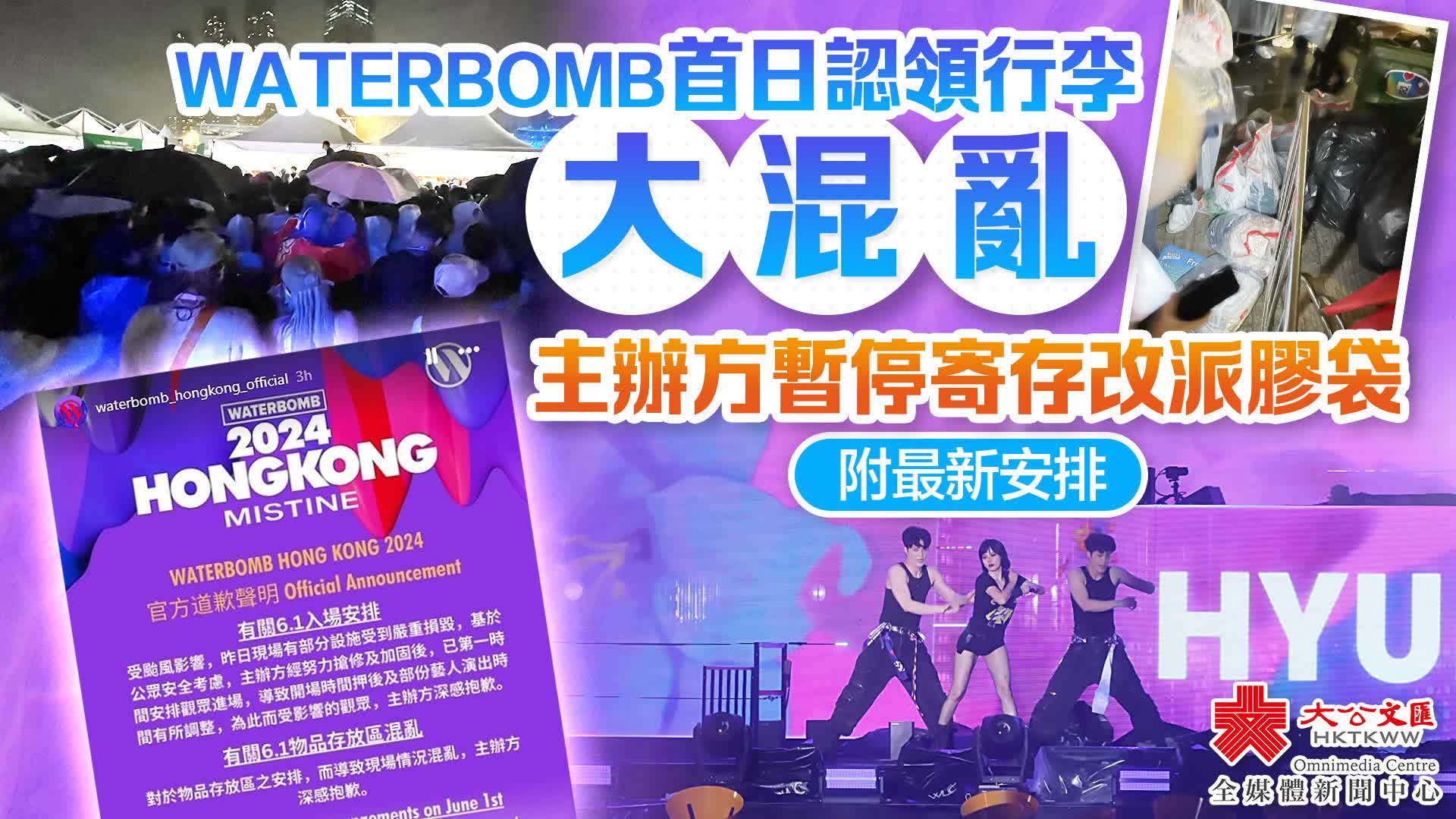 大公文匯全媒體報道,大型潑水音樂節WATERBOMB以豪華陣容首度襲港,一連兩日(6月1、2日)在西九文化區舉行。惟首日由於3號風球,進場安排延誤,且完場後觀眾認領行李出現混亂,引發不少觀眾不滿。主辦方今日(2日)發布道歉聲明,並更改今日安排。
