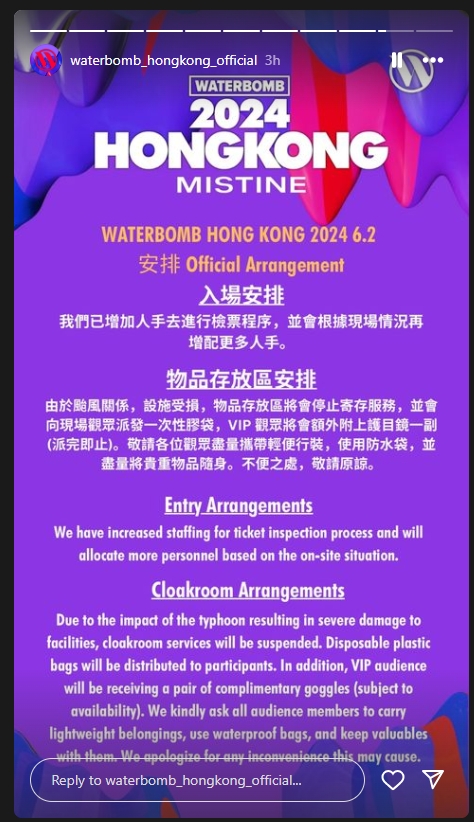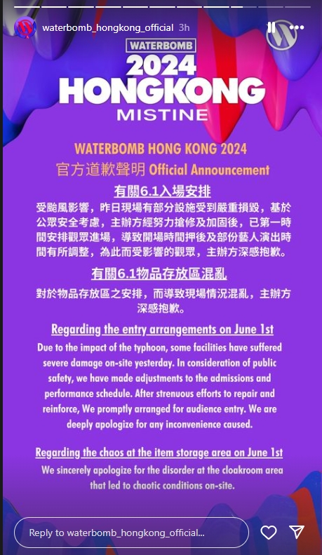 Waterbomb Hong Kong今日下午在社交平台Instagram發表聲明指,受颱風影響,昨日現場有部分設施受到嚴重損毀,基於公眾安全考慮,主辦方經努力搶修及加固後,已第一時間安排觀眾進場,導致開場時間押後及部分藝人演出時間有所調整,為此而受影響的觀眾,表示深感抱歉。