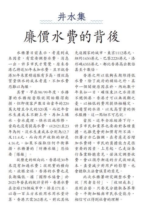 從歷史的縱向比,香港近30年來沒有加過水費;從現實的橫向比,放眼全球,香港的水費也是長期偏低。據「國際水協會」於2021年發表的統計資料,香港水費在全球178個城市中,排名171名。以每一百立方米飲用水用水量計算,香港只需262港元,對比其他先進國家的城市,東京1112港元、紐約1430港元、巴黎2220港元,洛杉磯4355港元,都比香港高出數倍甚至十數倍。