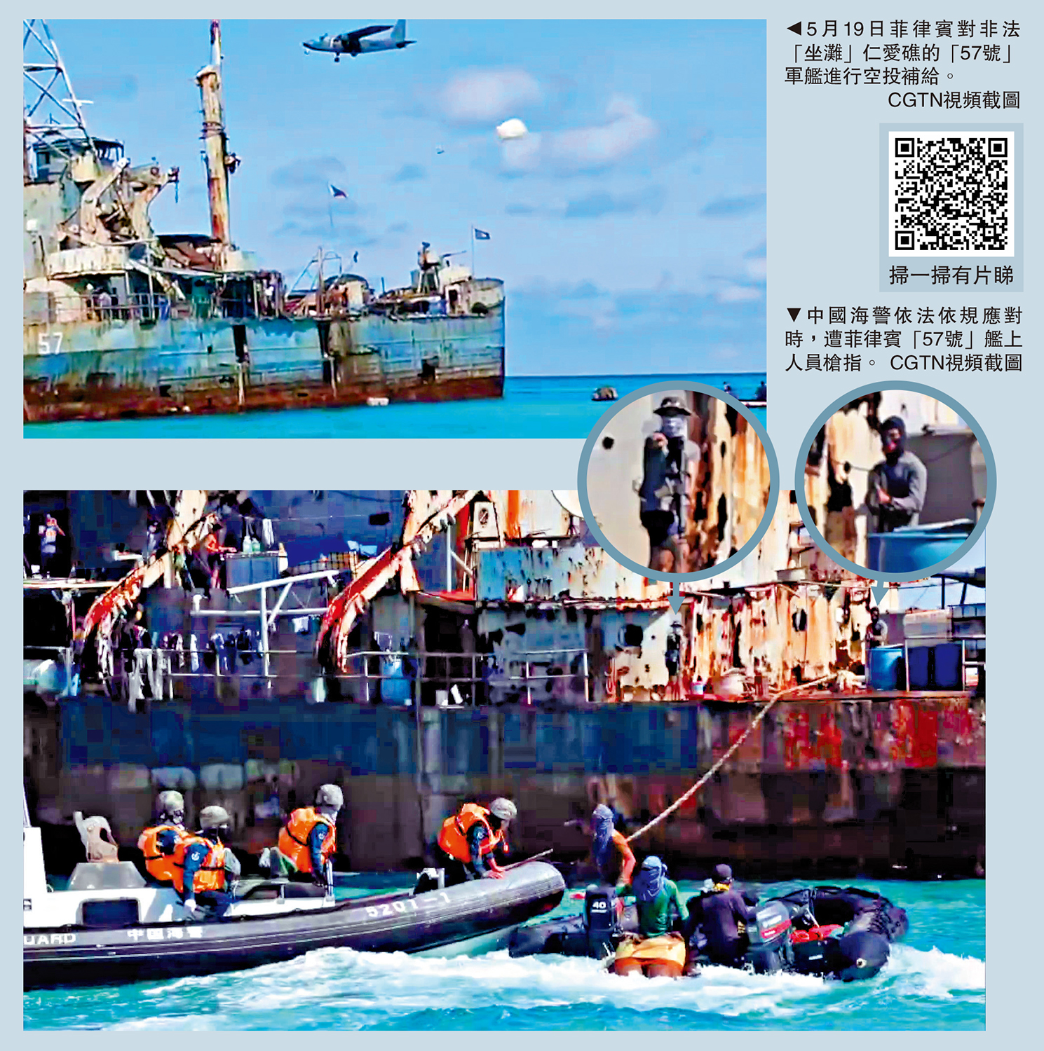 大公報據「CGTN記者團」微博6月2日消息,5月19日,菲律賓對非法「坐灘」仁愛礁的「57號」軍艦進行空投補給。中國海警依法依規應對時,發現菲「57號」艦上至少兩名人員持槍在甲板活動,並用手、用槍指着中國海警方向。關於南海問題,正在新加坡出席第21屆香格里拉對話會的中國國防部長董軍6月2日表示,中方對侵權挑釁行徑保持了足夠的克制,但這也是有限度的。希望個別國家要認清利害關係,回歸對話協商的正道。