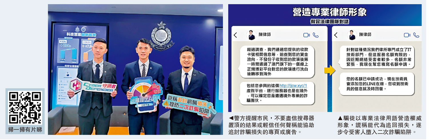 (大公報 記者 古倬勳)香港每13分鐘便發生一宗騙案!最近有騙徒聲稱是協助詐騙案受害人討回損失的法律團隊,透過假裝調查及提供法律意見,再誘使受害人支付所謂服務費騙取金錢,對詐騙案受害人造成二次傷害,有受害人因此損失逾600萬元。警方提醒市民,不要盡信搜尋器置頂的結果或輕信任何聲稱能協助追討詐騙損失的專頁或廣告。