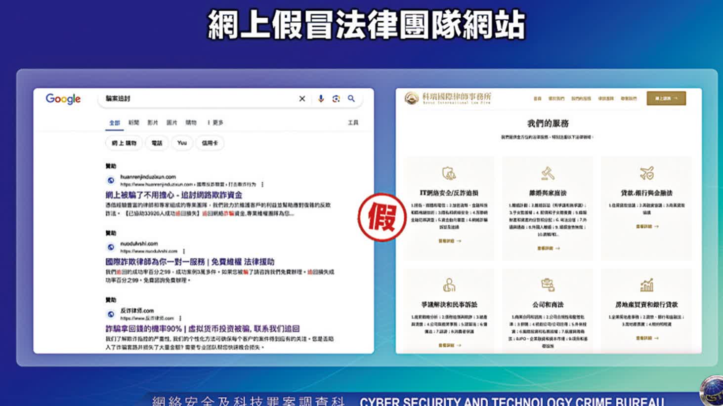 警方指,騙徒首先盜用官方圖片或標誌假冒法律團隊設立虛假網站或社交媒體專頁,盜用的圖片更包括反詐騙協調中心及警方「守網者」網站,再於搜尋器以「騙案」、「欺詐」、「騙案追討」等關鍵字為假網站投放廣告並置頂,以及在社交平台為假專頁投放廣告,以增加其曝光率及接觸率。