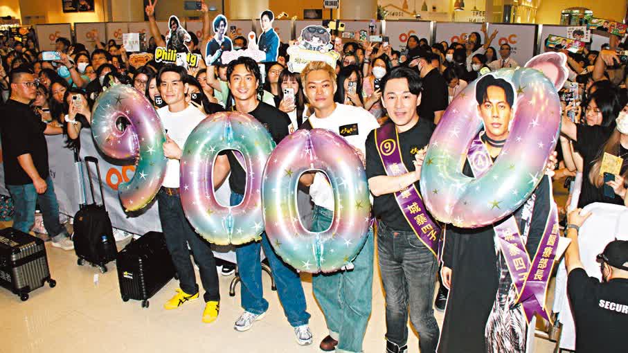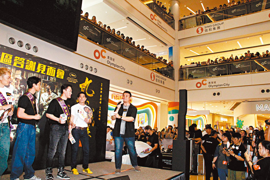 (香港文匯報記者 達里)氣勢如虹的電影《九龍城寨之圍城》的香港票房截至昨日已突破9,000萬港元,昨日4位主角「陳洛軍」林峯、「信一」劉俊謙、「十二少」胡子彤與「王九」伍允龍化身城寨福利委員會到商場與800位影迷見面,吸引過千位粉絲擠滿商場各層,氣勢一時無兩。眾粉絲有秩序地以流水式上台與4位演員近距離接觸,少見大場面的胡子彤就緊張得滿頭大汗,反而林峯、劉俊謙就神態自若,劉俊謙更不時與粉絲擺出心形手勢,有「國民老公」之稱的他果然名不虛傳。