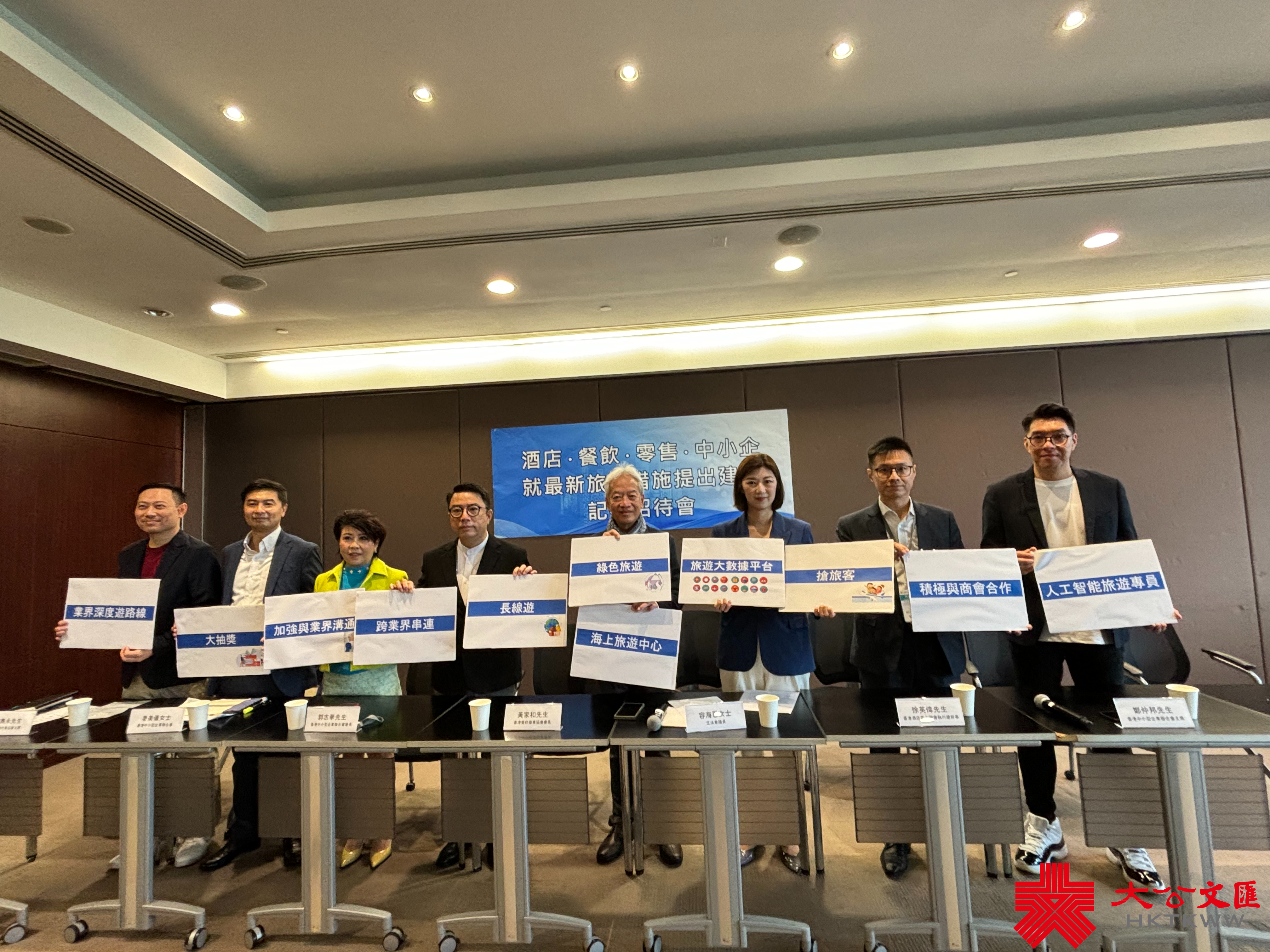 (大公文匯全媒體記者 李九歌)酒店、餐飲、零售、中小企今日(3日)舉行記者招待會,就最新旅遊措施提出建議,立法會議員容海恩、香港餐飲聯業協會會長黃家和、香港酒店業主聯會執行總幹事徐英偉等出席。