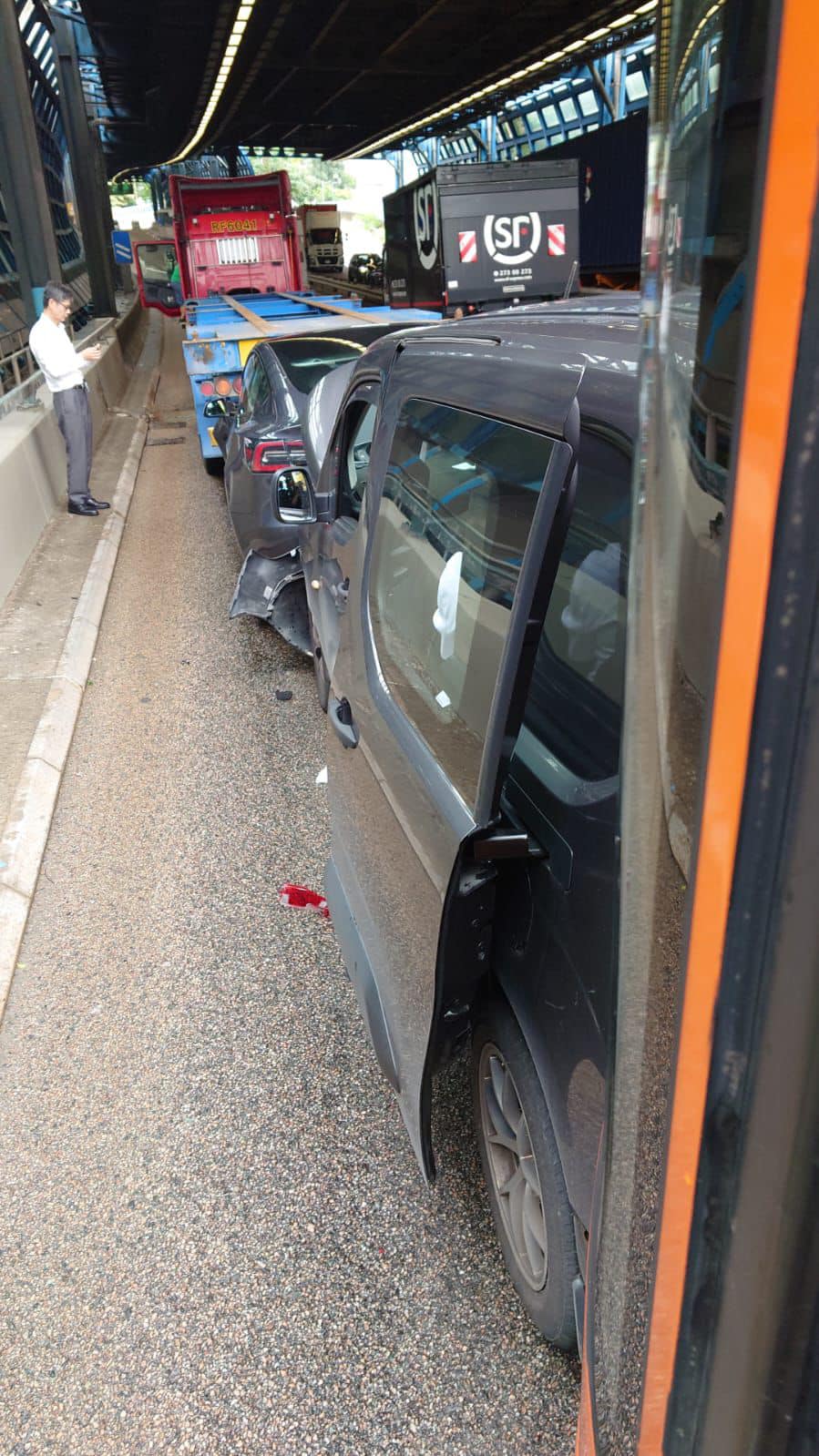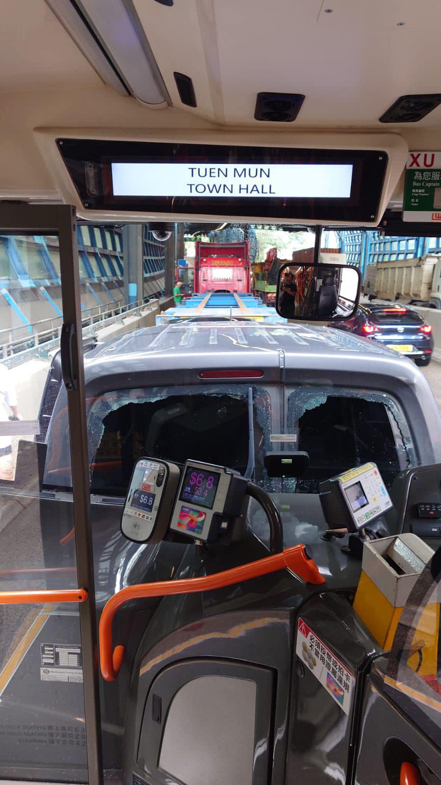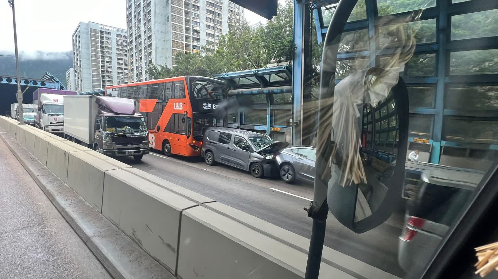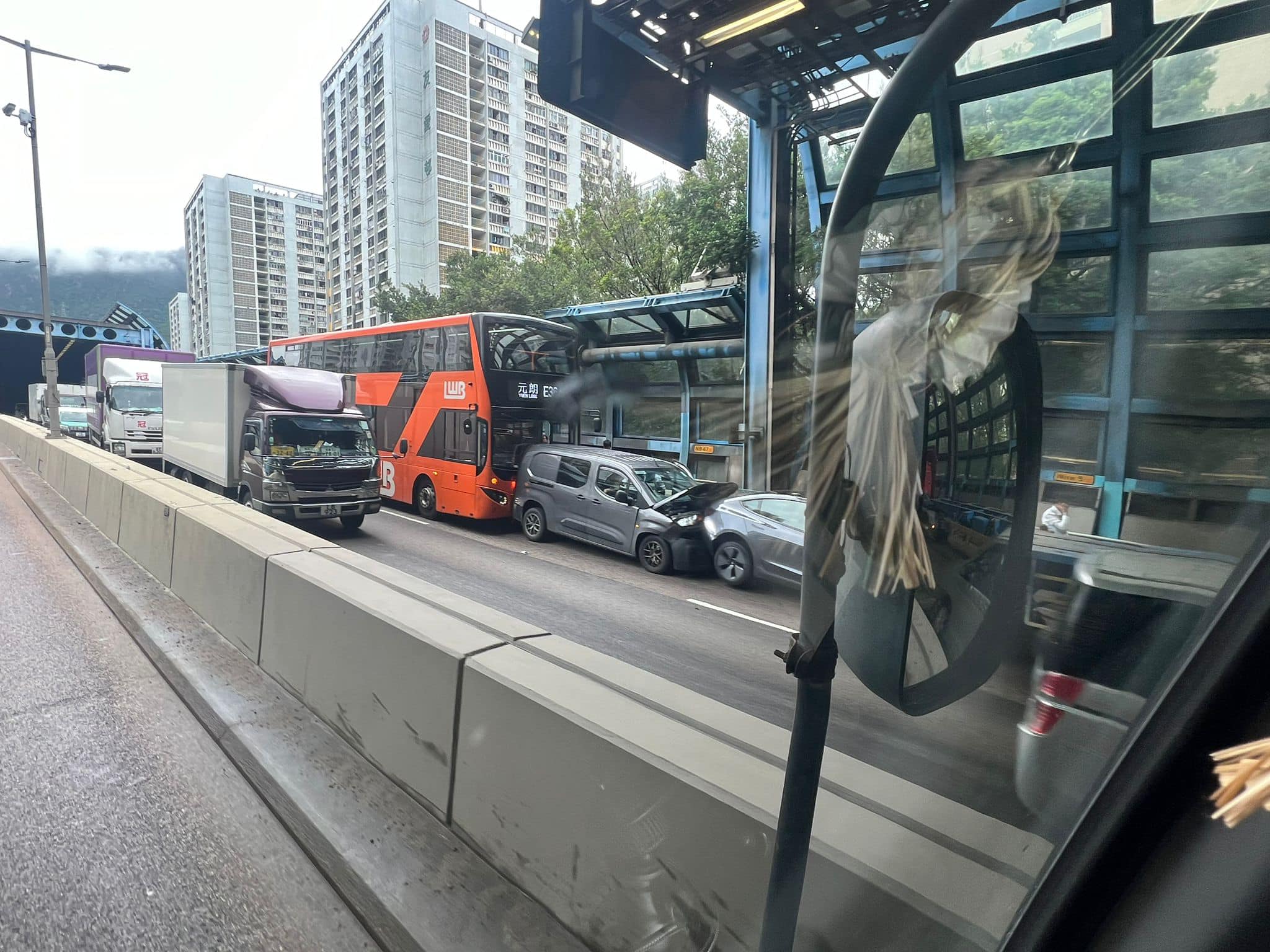 上述四架車沿屯門皇珠路出九龍方向,駛近安定邨對開時,疑因拖頭慢駛,隨後的私家車收掣不及撞上,其後的輕型貨車及巴士亦前後串燒相撞。