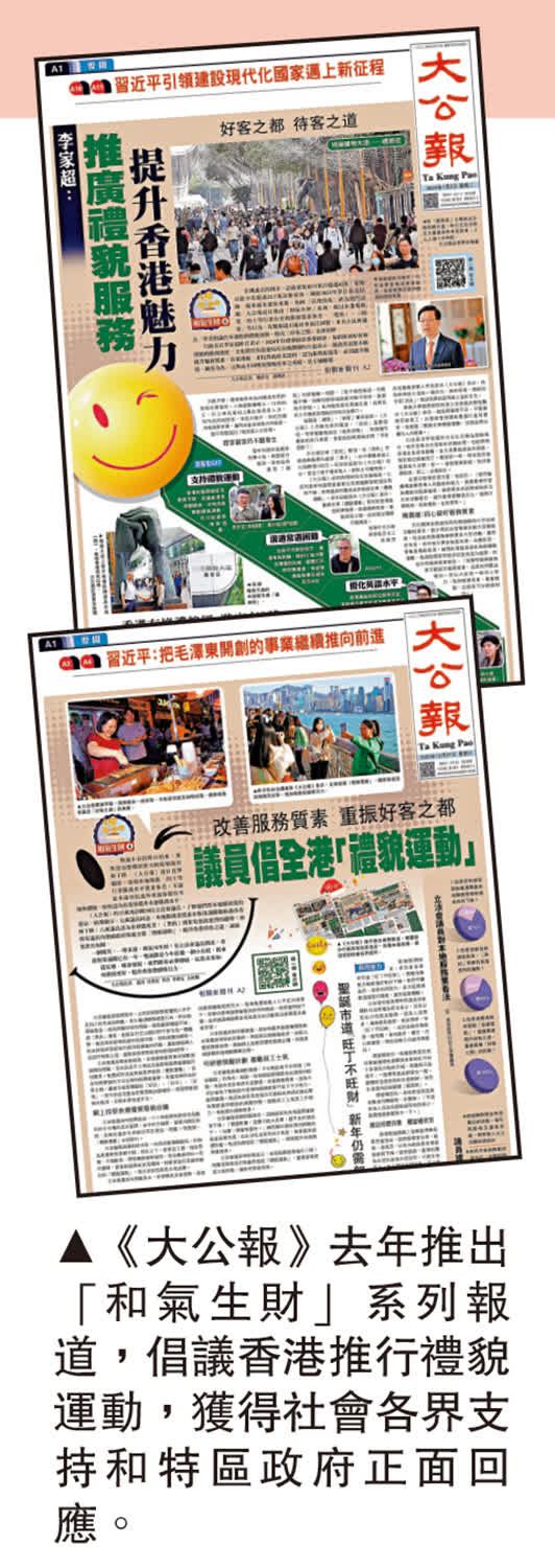 《大公報》從去年底推出「和氣生財」系列報道,深入探討多個服務行業的待客態度問題,尤其是本地餐飲業、的士等對待遊客的服務態度,引起大眾對香港旅遊服務業「待客之道」的關注。《大公報》並請相關持份者建言獻策,引起各界重視,和氣生財,以優質服務促進高質量發展,助力香港由治及興。一眾議員倡議發起全港「禮貌運動」,呼籲提升香港待客之道,擦亮 「好客之都」金漆招牌。