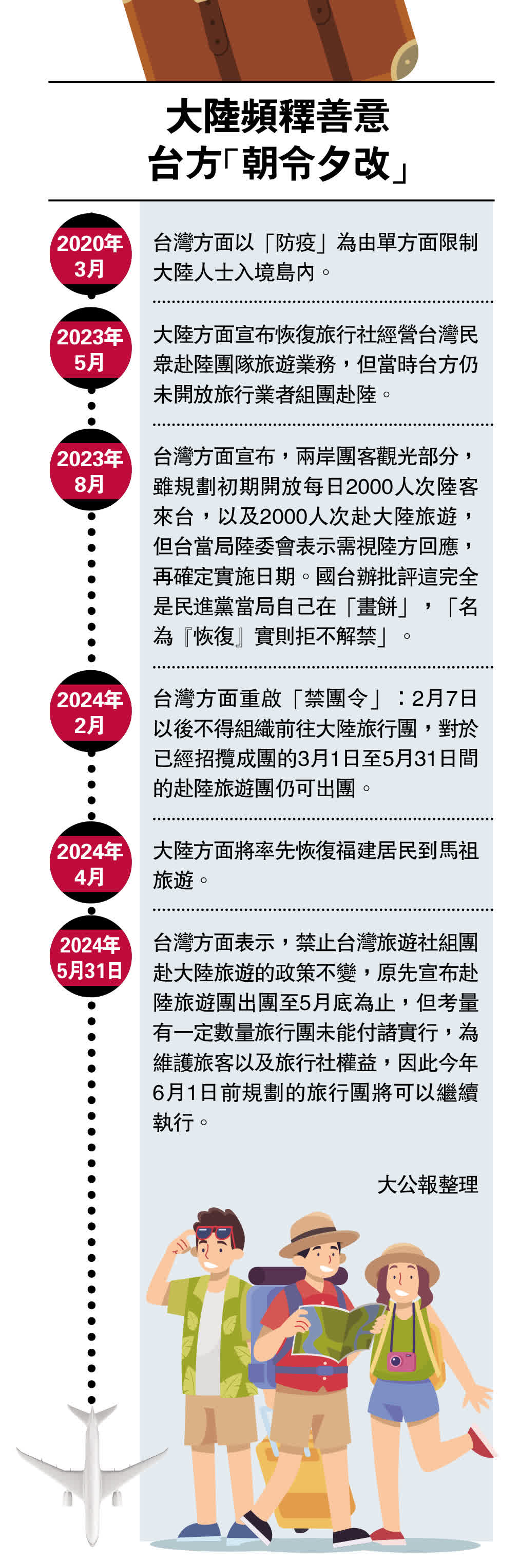 2020年初,民進黨當局單方面禁止大陸居民赴台,並叫停島內旅行社經營赴大陸團隊遊業務;去年11月承諾今年3月解除「禁團令」,不料今年2月突然要求旅行社停止招攬赴大陸團客,6月1日起不准出團。