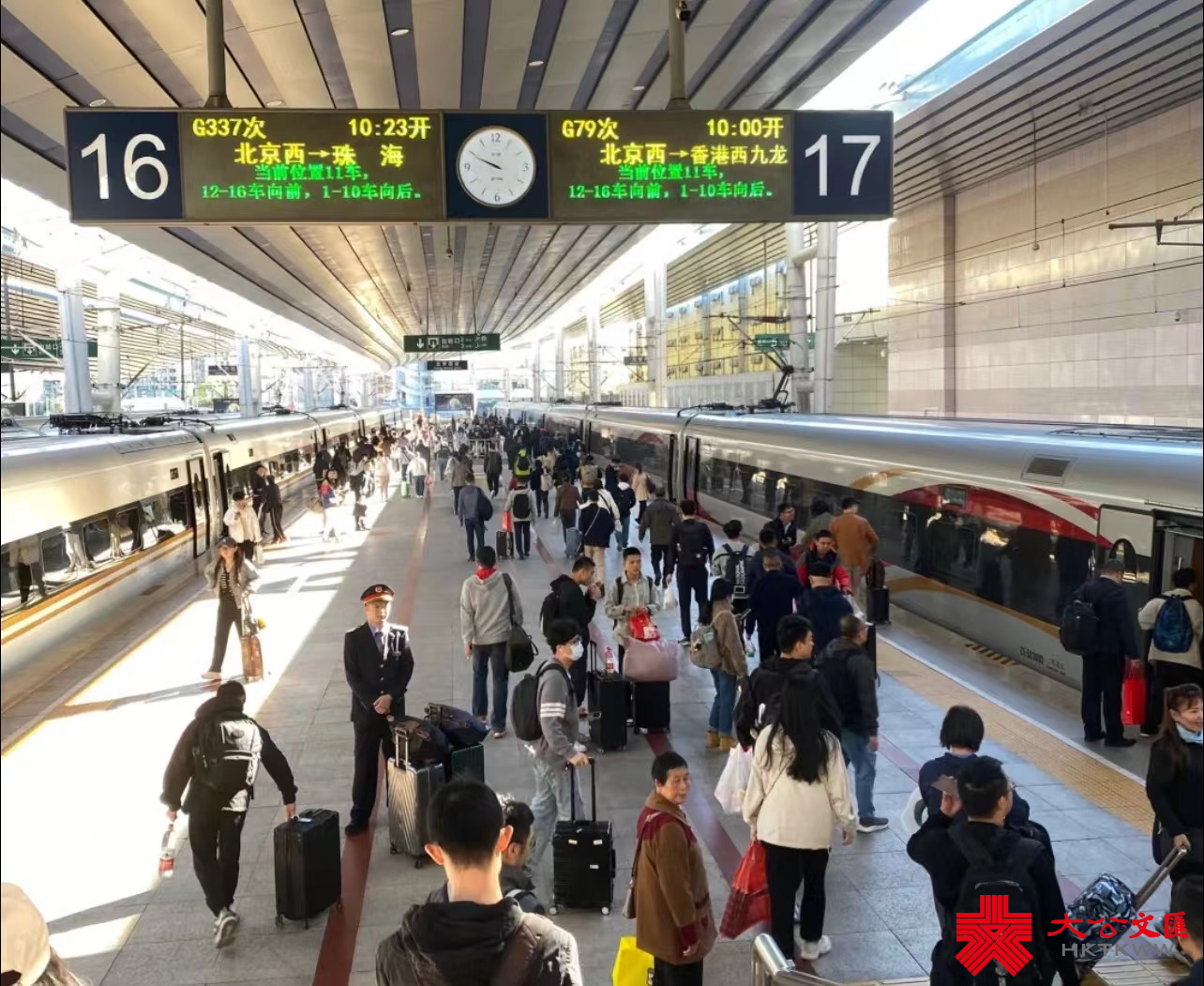 此外,在通關模式方面,由原普速直通車始發、終到站「兩地兩檢」通關模式改為高鐵列車統一在香港西九龍站實行「一地兩檢」,通關時間大幅壓縮。旅客還可在京港、滬港高鐵列車沿線的石家莊、廣州、深圳北、杭州東等多個站點出發或到達,跨境旅行更為便捷。車次的開行日期也進行了優化調整,由原本的隔日開行改為周五、周六、周日、周一開行模式,每周開行數量由原普速直通車的14列增至高鐵動臥列車的16列,為旅客周末跨境往返提供便利。