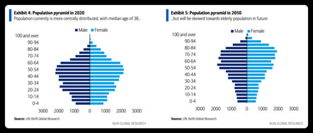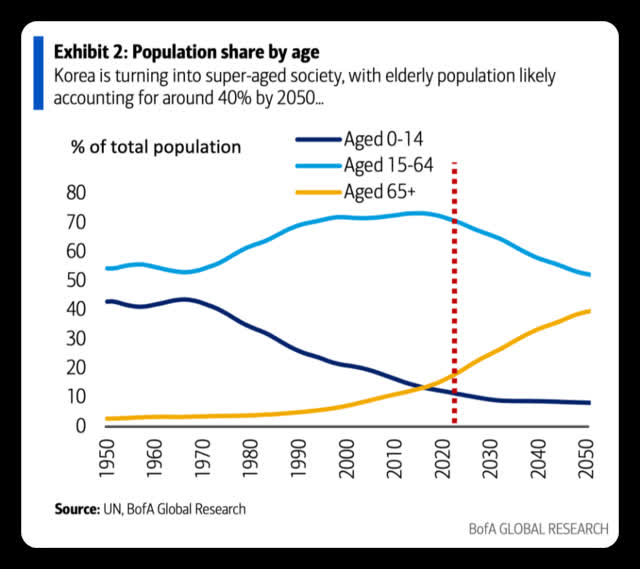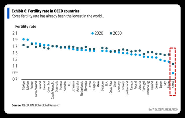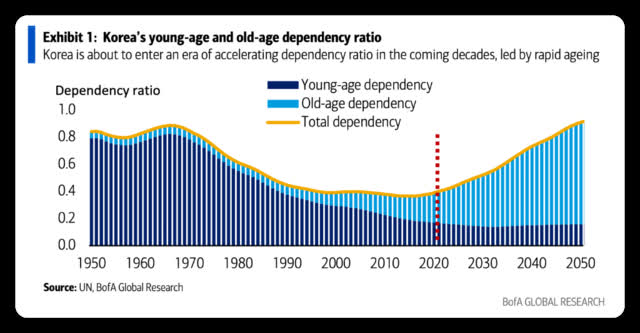 報告指出,該趨勢將使韓國的總撫養比率 (非工作年齡人口與工作年齡人口的比率) 從當前的0.4攀升至2050年約0.9。即差不多每位成人要撫養一位老人/孩子。美銀相信,如果生育率繼續走低,韓國很快將走上人口自然減少的軌道。