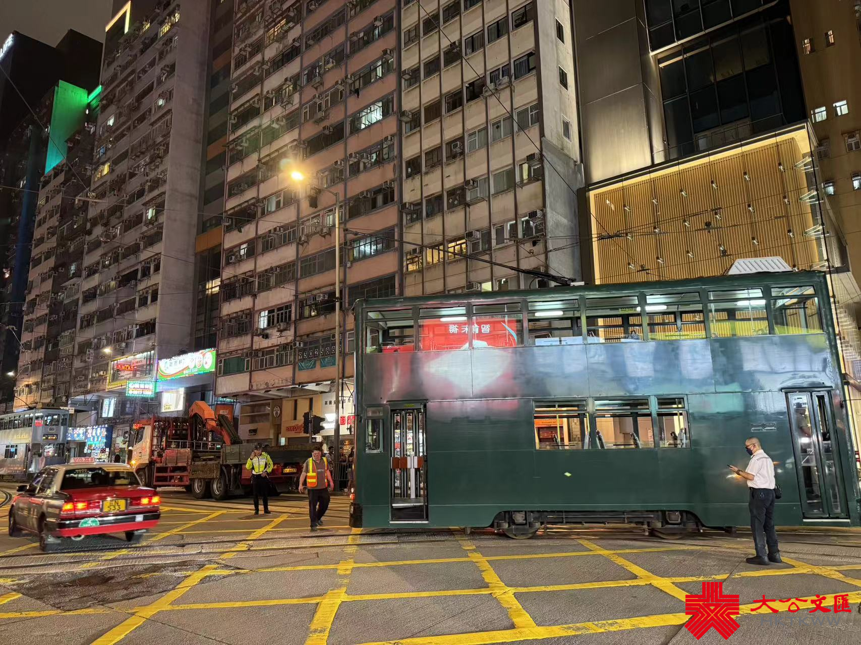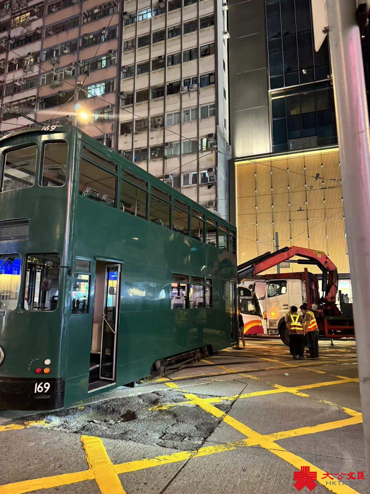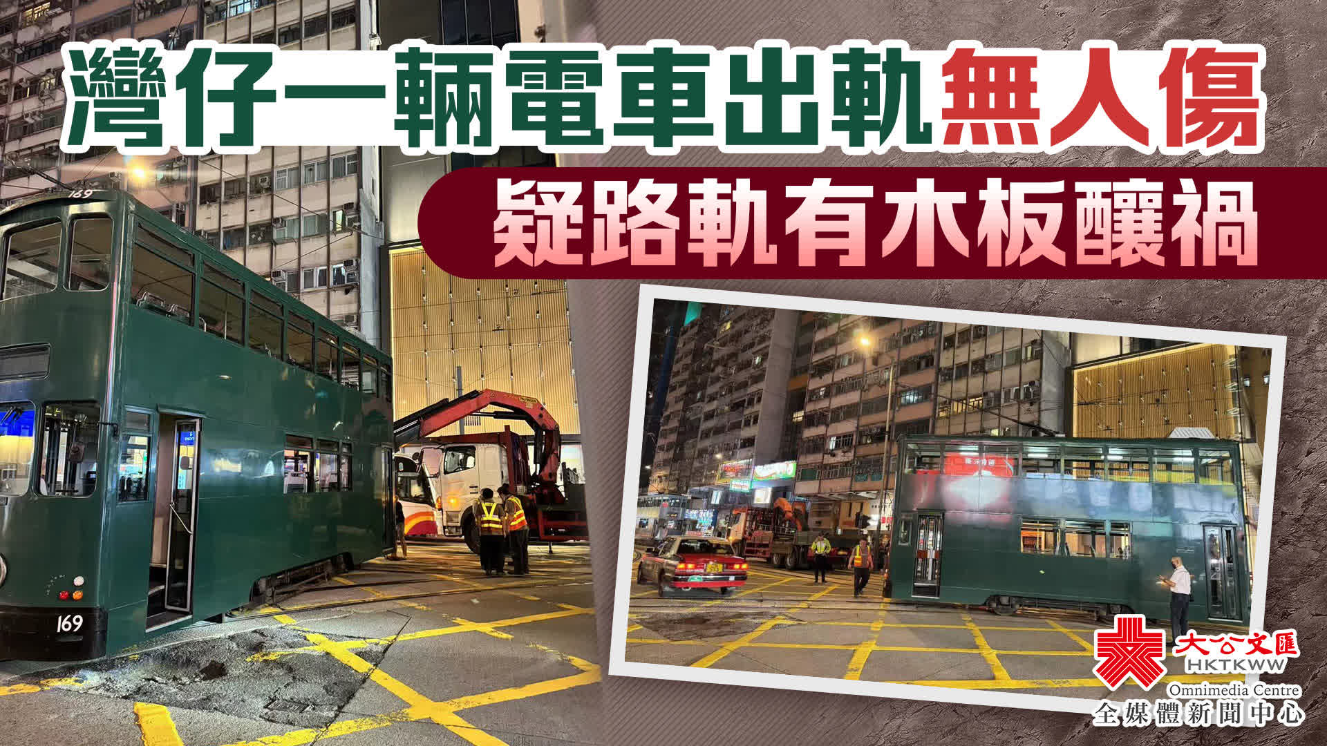 大公文匯全媒體報道,今日(4日)晚上8時許,一輛在灣仔軒尼詩道西行電車,駛至天樂里交界時,疑因撞到路軌上一根木條出軌,事件中無人受傷。