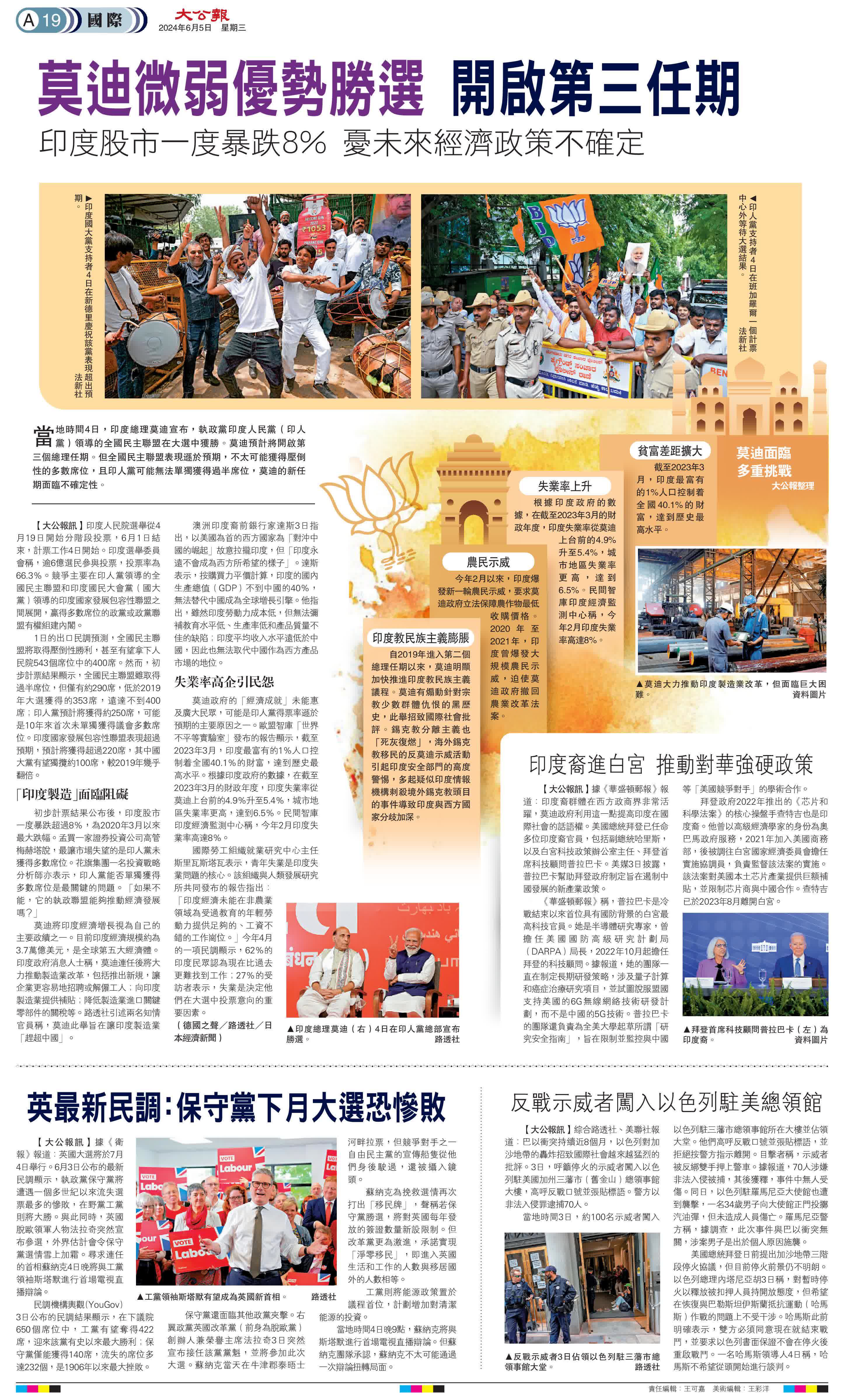 大公報綜合德國之聲、路透社、日本經濟新聞報道,當地時間4日,印度總理莫迪宣布,執政黨印度人民黨(印人黨)領導的全國民主聯盟在大選中獲勝。莫迪預計將開啟第三個總理任期。但全國民主聯盟表現遜於預期,不太可能獲得壓倒性的多數席位,且印人黨可能無法單獨獲得過半席位,莫迪的新任期面臨不確定性。