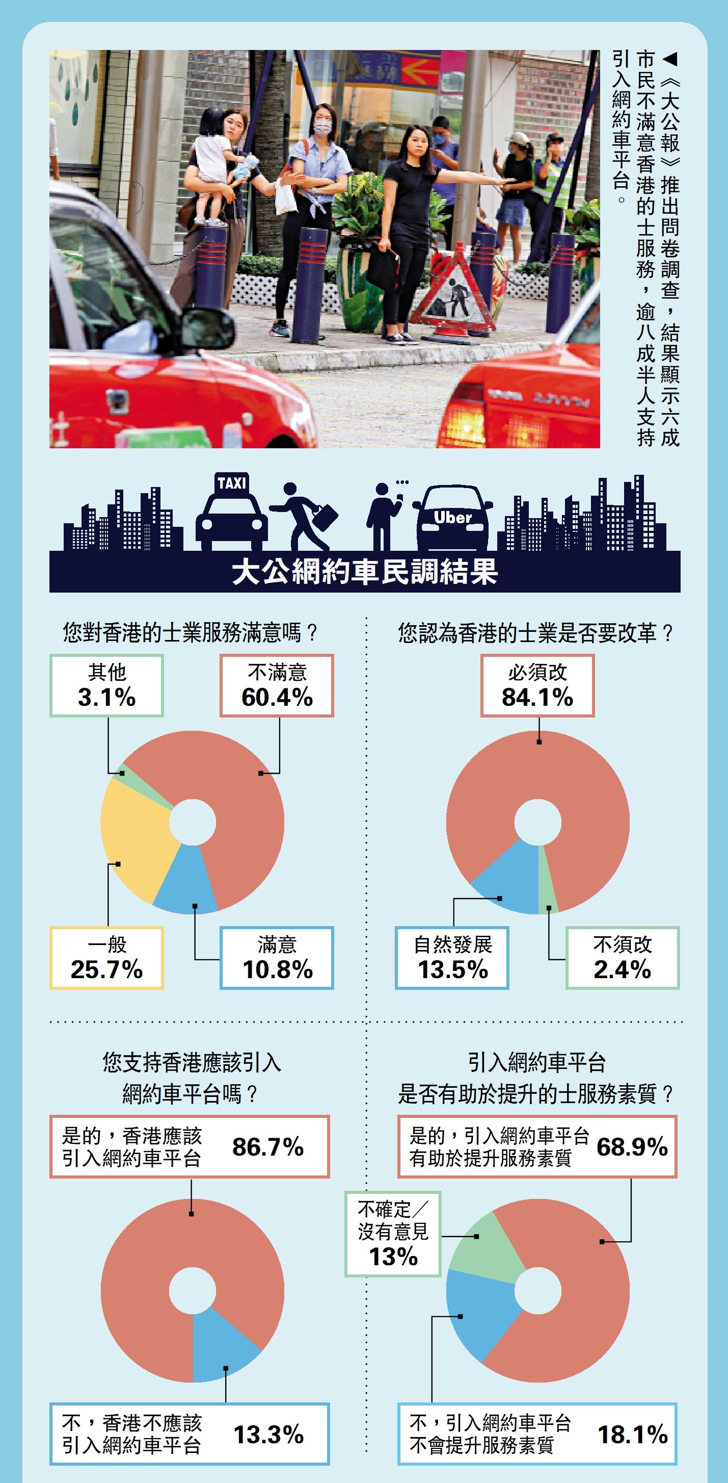 大公報facebook於5月18日下午發起問卷調查,截至昨晚10時共收到1124人回覆,當中逾六成市民不滿香港的士業服務,近八成半人認為要改革的士業,引入並規管網約車平台。有市民建議香港的士應全面電子收費,政府亦應加強監管。立法會交通事務委員會主席陳恒鑌表示,大公報fb問卷調查結果顯示,的士服務仍有很大提升空間,認為規管網約車平台的同時,要提升1.8萬多輛的士服務質素。