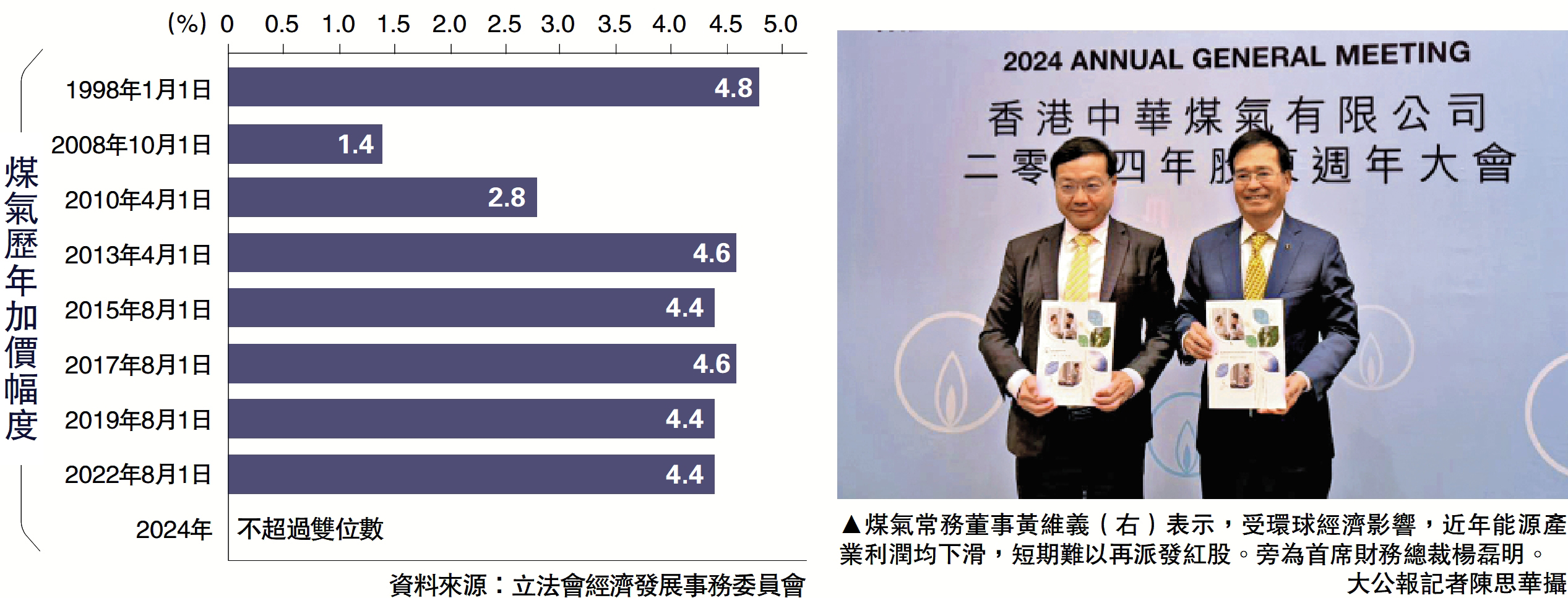 (大公報 記者 陳思華)香港中華煤氣(00003)昨日舉行股東周年大會,常務董事黃維義在會後透露,受環球經濟影響,近年能源產業利潤均下滑,短期難以再派發紅股。同時,有關煤氣加價事項已經與特區政府溝通,且回應正面。他表示,考慮到香港整體經營環境及市民的承受能力,今次加價範圍比較「合適」,不會超過雙位數,至於何時開始加價,有待特區政府進一步消息。