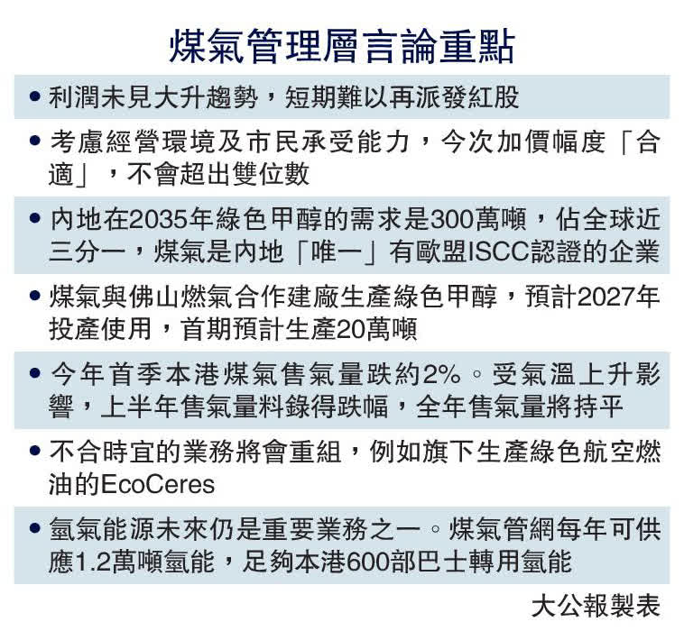 另外,黃維義表示,綠色甲醇也是未來業務增長的機會之一,估計到2035年,內地綠色甲醇的需求達到300萬噸,佔全球需求三分一,市場潛力巨大,而煤氣是內地唯一有歐盟ISCC認證的企業,故吸引不少內地公司有意合作。他透露,上海申能集團已經有意向煤氣購買綠色甲醇。