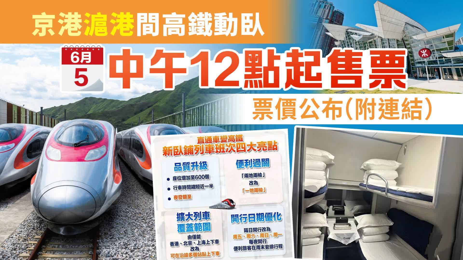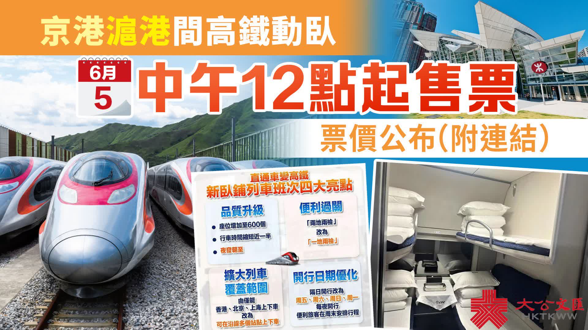 大公文匯全媒體報道,中國鐵路宣布,6月15日起,北京西、上海與香港紅磡站間開行的普速直通車Z97/98、Z99/100次提質升級為北京西、上海虹橋與香港西九龍站間的高鐵動臥列車D909/910、D907/908次,北京至香港的全程旅行時間由24時31分壓縮至12小時34分,上海至香港的全程旅行時間由19時34分壓縮至11小時14分,京港、滬港間實現夕發朝至,香港與內地間的人員往來將更加便利。