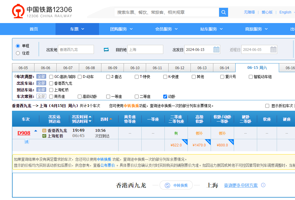 上海虹橋至香港西九龍站間開行的高鐵動臥列車經滬杭、杭深、廣深港高鐵運行,其中,D907次列車自上海虹橋站20點15分開車,次日7點29分抵達香港西九龍站;D908次列車自香港西九龍站19點49分開車,次日6點45分抵達上海虹橋站。