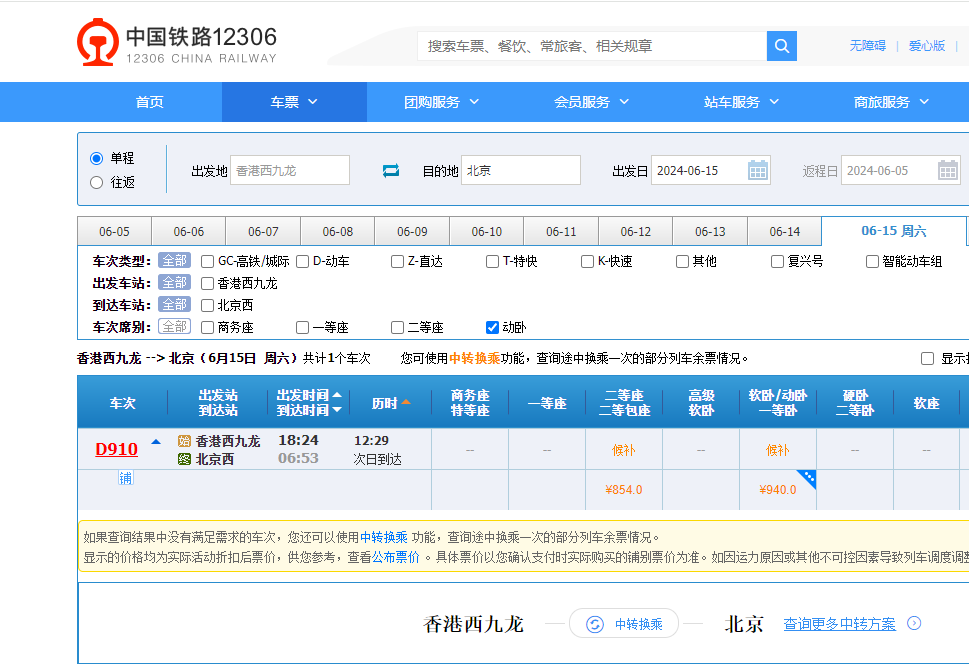 車票今日(5日)中午12點開始售票,大公文匯全媒體記者實測發現,開售僅3分鐘,香港西九龍至北京西的高鐵動臥的首日(6月15日)車票已經售罄,目前二等座、動臥上鋪及下鋪均已售罄,需要候補購票。
