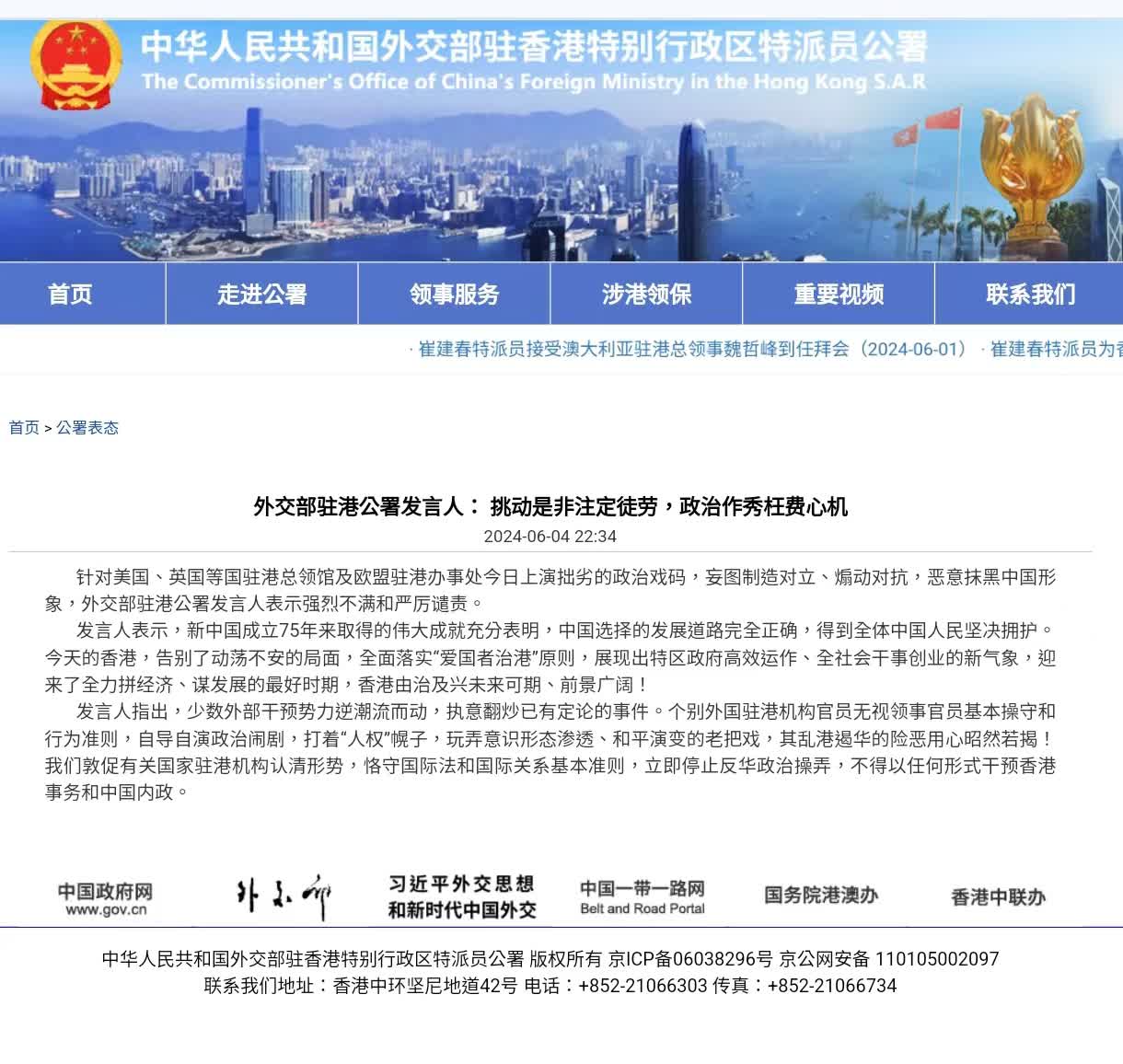 大公文匯網報道,6月4日,針對美國、英國等國駐港總領館及歐盟駐港辦事處今日上演拙劣的政治戲碼,妄圖製造對立、煽動對抗,惡意抹黑中國形象,外交部駐港公署發言人表示強烈不滿和嚴厲譴責。