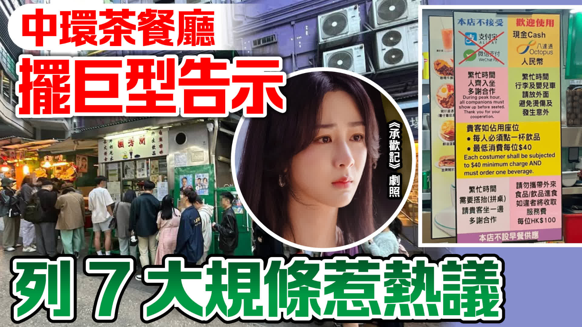 該名內地網民在小紅書上載一張位於中環的茶餐廳門口的照片,顯示巨型告示牌上用大字列明七大「規條」,包括「本店不接受支付寶及微信支付」、「歡迎使用現金、八達通或人民幣」、「繁忙時間人齊入座,多謝合作」、「繁忙時間行李及嬰兒車請放外面,避免燙傷及發生意外」、「貴客與佔用座位,每人必須點一杯飲品,最低消費每位$40」、「繁忙時間需要搭枱,請貴賓坐一邊,多謝合作」、「請勿攜帶外來食品或飲品進食,如違者將收取服務費每位HK$100」,另外又寫明該店內不設早餐供應。