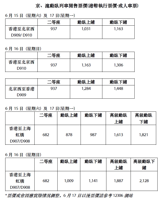 12306公布的票價表顯示,高鐵動臥實行浮動票價,6月15日(星期六)及6月17日(星期一),香港西九龍至北京西的D910次列車,動臥上鋪為940元(人民幣,下同),動臥下鋪為1060元,二等座為854元。6月16日(星期日),香港西九龍至北京西的D910次列車,動臥上鋪為1060元,動臥下鋪為1190元,二等座為854元。