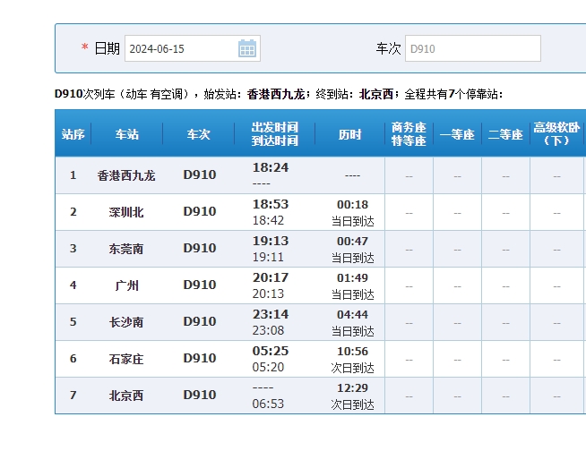 北京西至香港西九龍站間開行的高鐵動臥列車經京廣、廣深港高鐵運行。其中,D910次列車自香港西九龍站傍晚6點24分開車,沿途經停深圳北、東莞南、廣州、長沙南、石家莊站,次日早上6點53分抵達北京西站。