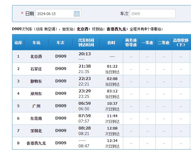 D909次列車自北京西站晚上8點13分開車,沿途經停石家莊、邯鄲東、鄭州東、廣州、東莞南、深圳北站,次日早上8點47分抵達香港西九龍站。至於由北京西往香港西九龍站的動臥票價,6月15日及6月17日的D909次列車,動臥上鋪為人民幣940元,動臥下鋪為1060元,二等座為854元。6月16日的D909次列車,動臥上鋪為1170元,動臥下鋪為1330元,二等座為854元。