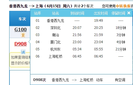 上海虹橋至香港西九龍站間開行的高鐵動臥列車經滬杭、杭深、廣深港高鐵運行。其中,D908次列車自香港西九龍站晚上7點49分開車,沿途經停深圳北、潮汕、廈門北、杭州東站,次日早上6點45分抵達上海虹橋站。由香港西九龍至上海虹橋的動臥票價,6月15日及6月17日的D908次列車,動臥上鋪為800元,動臥下鋪為900元,高級動臥上鋪為1470元,高級動臥下鋪為1670元,二等座為622元。6月16日的D908次列車,動臥上鋪為920元,動臥下鋪為1040元,二等座為622元。