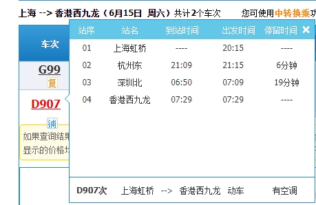 D907次列車自上海虹橋站晚上8點15分開車,沿途只經停杭州東站和深圳北站,次日早上7點29分抵達香港西九龍站。由上海虹橋至香港西九龍的票價,6月15日及6月17日D907次列車的動臥上鋪為800元,動臥下鋪為900元,二等座為622元。6月16日的D907次列車,動臥上鋪為920元,動臥下鋪為1040元,高級動臥上鋪為1720元,高級動臥下鋪為1940元,二等座為622元。