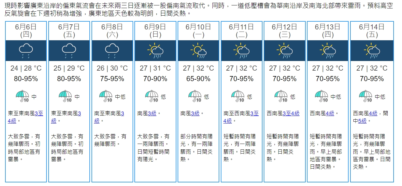 天文台表示,現時影響廣東沿岸的偏東氣流會在未來兩三日逐漸被一股偏南氣流取代。同時,一道低壓槽會為華南沿岸及南海北部帶來雷雨。預料高空反氣旋會在下周初稍為增強,廣東地區天色較為明朗,日間炎熱。