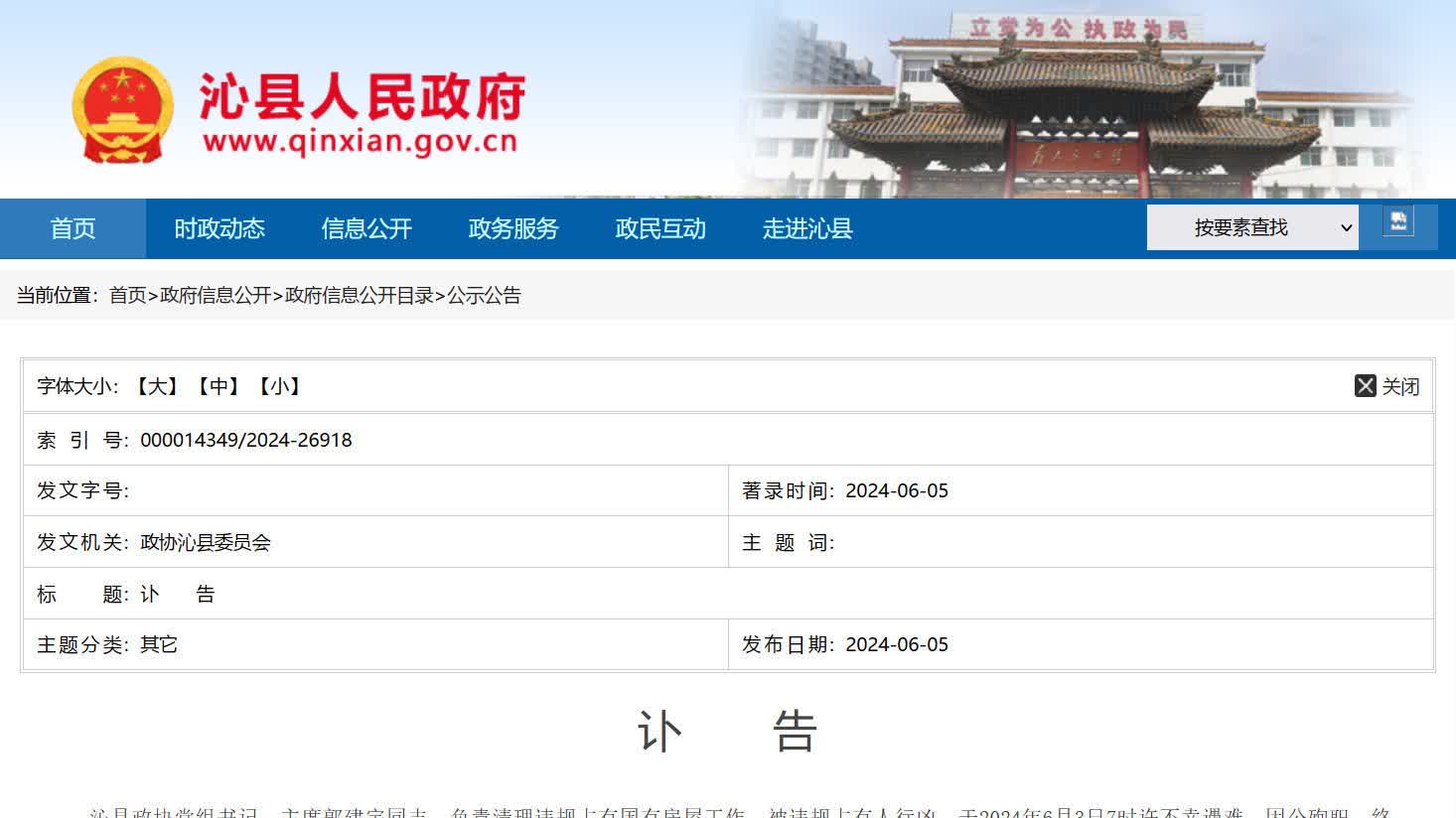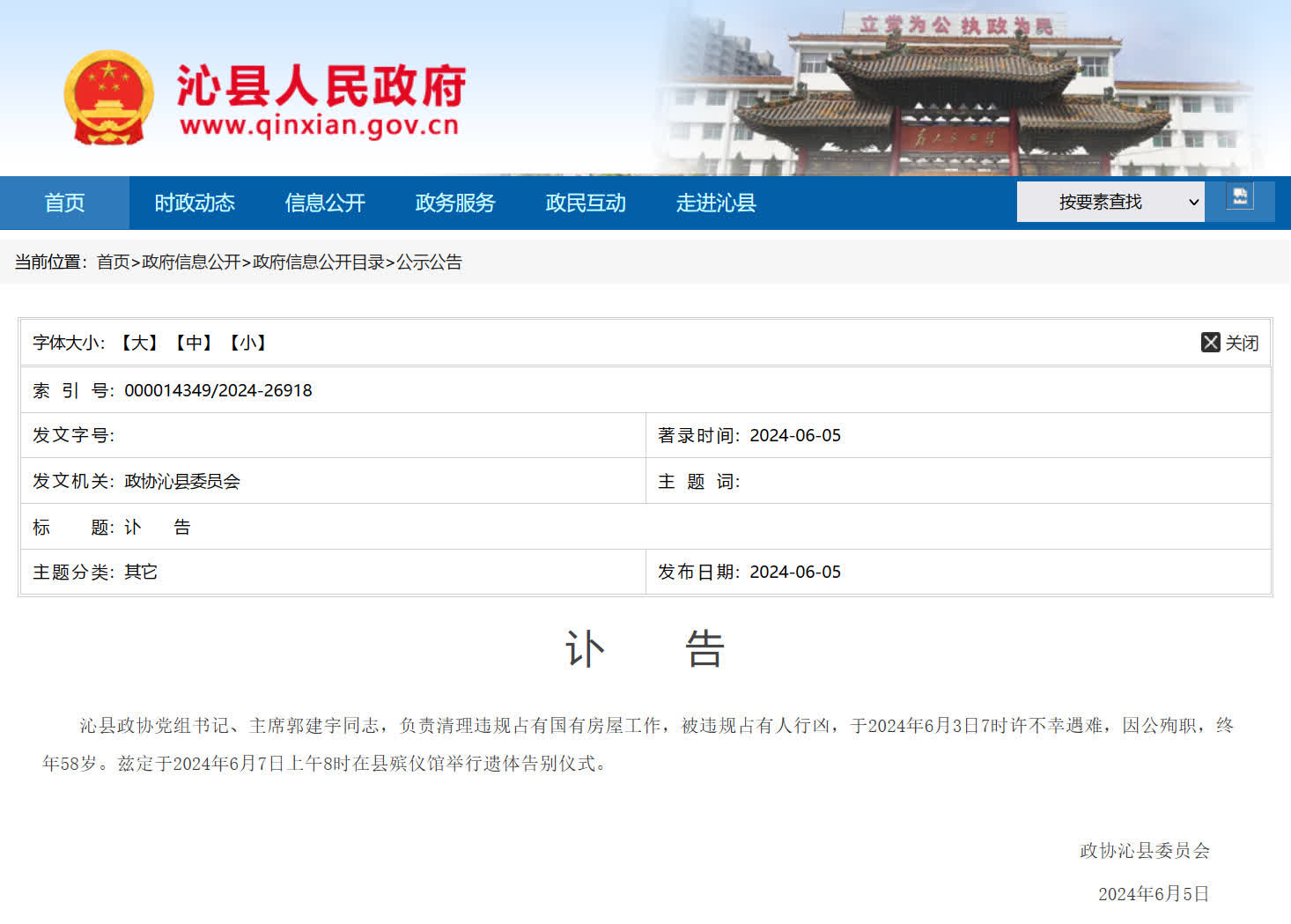 據沁縣政府網站消息,政協沁縣委員會6月5日發布訃告:沁縣政協黨組書記、主席郭建宇同志,負責清理違規佔有國有房屋工作,被違規佔有人行兇,於2024年6月3日7時許不幸遇難,因公殉職,終年58歲。茲定於2024年6月7日上午8時在縣殯儀館舉行遺體告別儀式。