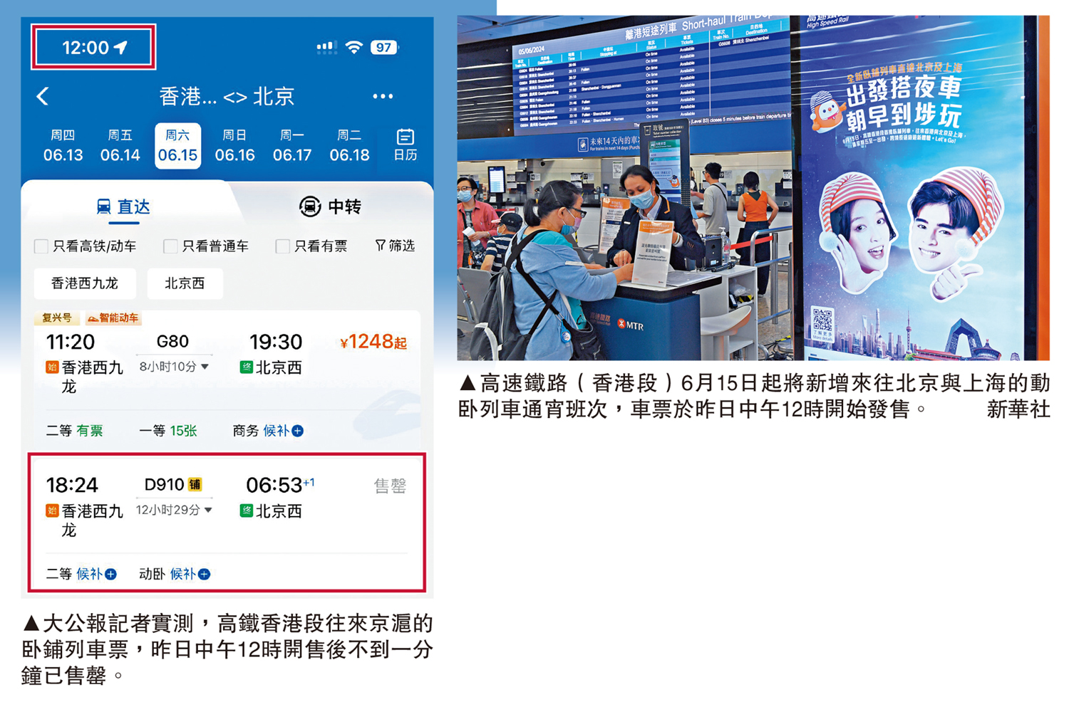 大公報記者分別在香港和北京實測購票。在香港,記者嘗試12306手機應用程式(App)購票,但發現開售僅一分鐘,已顯示由香港西九龍到北京西站的動卧車票已售罄,僅餘下「候補」,翌日班次仍有少量車票;至於香港前往上海虹橋站的列車票,首班卧鋪車「高級軟卧」及「動卧」,也迅即全部列成「候補」,只剩二等座車票出售,翌日尚餘少量車票。