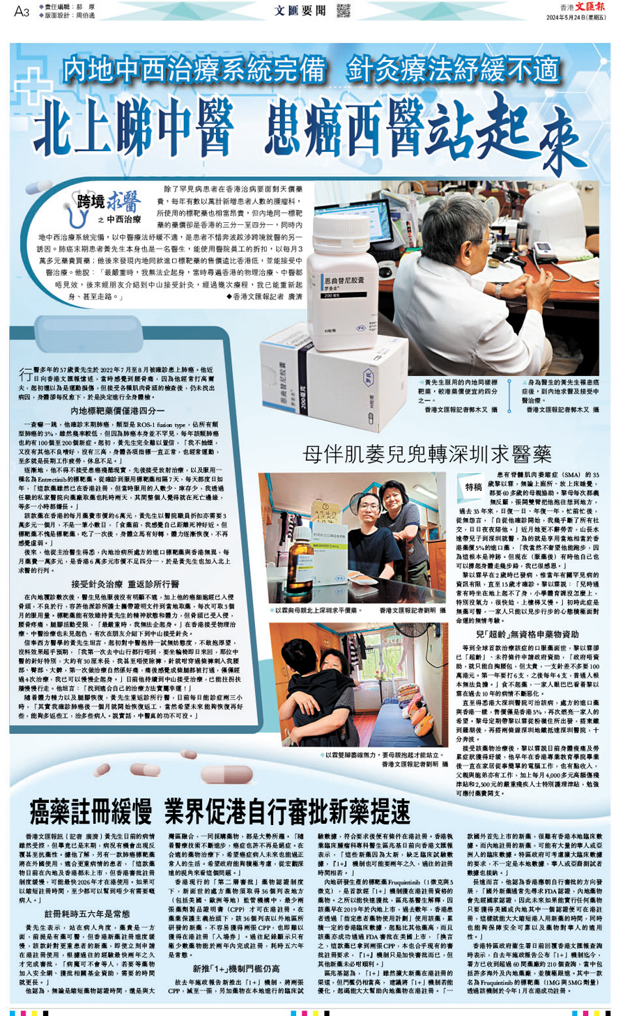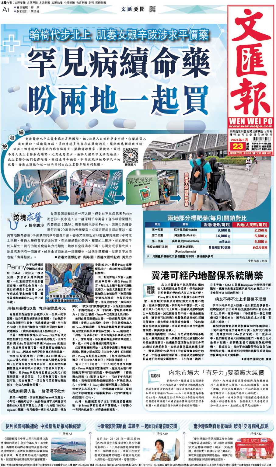 30歲的脊髓肌肉萎縮症患者Penny因為超齡無法申請特區政府的藥物資助,又無力支付每月20萬元藥費,去年起到港大深圳醫院求醫,同款進口藥當地只售1萬多元人民幣,平均每月北上覆診一次,每次也花八小時長征,其間更滴水不沾,十分折騰。她向香港文匯報表示,最希望病情穩定後,能減少北上覆診次數,其間由香港醫生跟進病情,藥物就經速遞到港,最能幫忙病人,但過程中兩地醫生必須有良好的溝通渠道,合力跟進其病況。