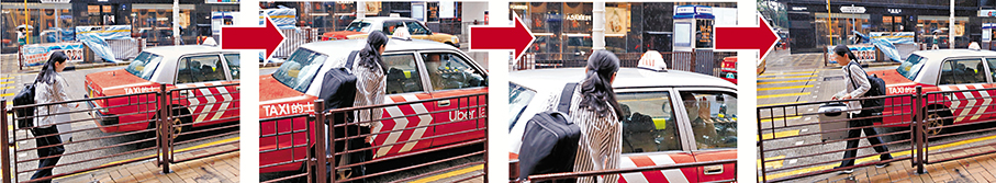 女子由於趕時間,狼狽地拖着行李箱橫過馬路向海防道方向離去。該兩輛的士則一直停在路邊,司機聲稱的網約客遲遲未到。