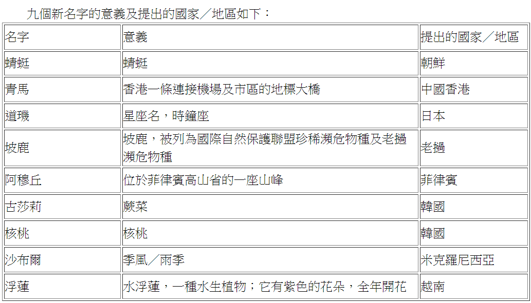 新名字於颱風委員會的第56屆會議中通過採用。颱風委員會為聯合國亞洲及太平洋經濟社會委員會和世界氣象組織轄下的組織。