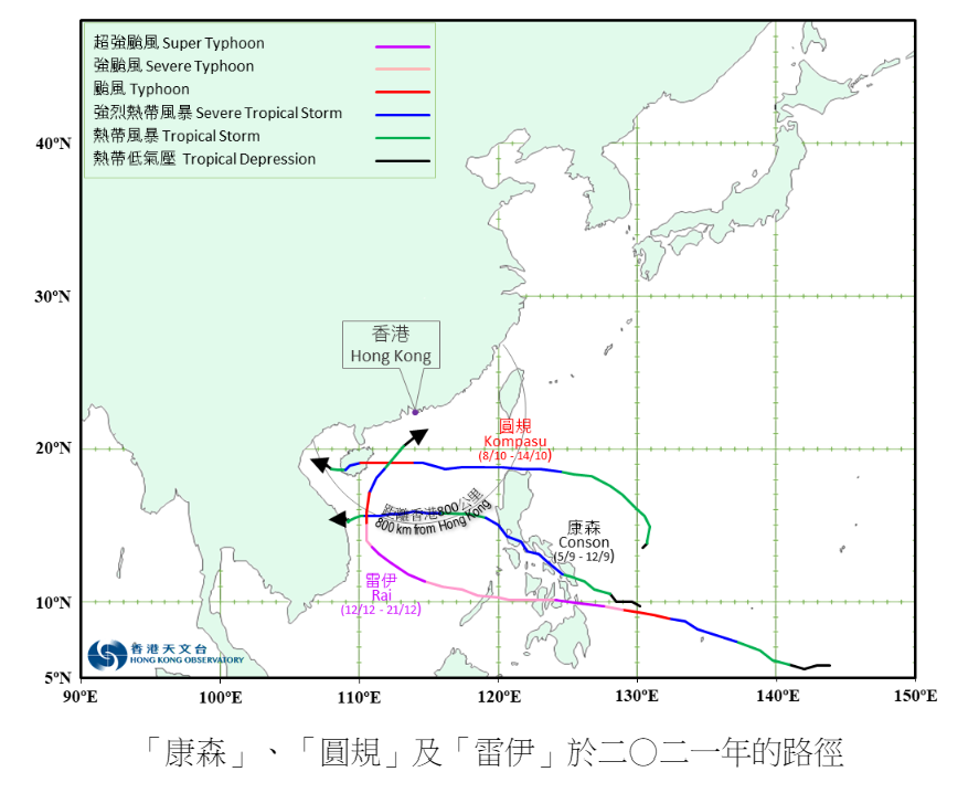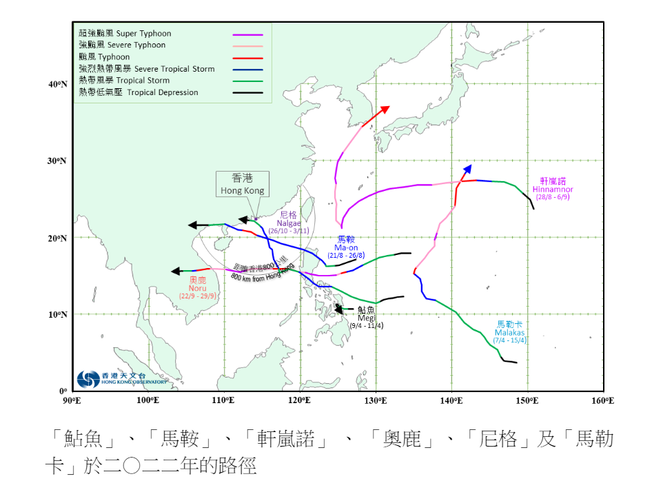 根據慣例,颱風委員會會考慮將造成重大人命傷亡和經濟損失的熱帶氣旋除名。強烈熱帶風暴「康森」於2021年9月初吹襲菲律賓,造成20人死亡、33人受傷及4人失蹤,亦令當地約9000幢建築物受損。颱風「圓規」於2021年十月吹襲菲律賓,造成43人死亡、5人受傷及16人失蹤,超過50萬人須要撤離。而在2021年12月吹襲菲律賓的超強颱風「雷伊」是自1961年以來首個在12月於南海出現的超強颱風。「雷伊」橫過菲律賓期間造成406人死亡及65人失蹤,超過1200人受傷,經濟損失超過332億菲律賓披索。熱帶風暴「鮎魚」於2022年4月為菲律賓帶來暴雨,多處出現水浸及山泥傾瀉,造成214人死亡及132人失蹤,超過200萬人受災。颱風「馬鞍」於2022年8月下旬吹襲菲律賓,造成3人死亡及4人受傷。而於2022年8月至9月吹襲韓國的超強颱風「軒嵐諾」是2022年北太平洋西部及南海區域最強的熱帶氣旋,「軒嵐諾」在韓國造成11人死亡及一人失蹤,超過5000間房屋受損,經濟損失超過2440億韓圓。超強颱風「奧鹿」於2022年9月吹襲菲律賓,造成12人死亡、68人受傷及5人失蹤。強烈熱帶風暴「尼格」於2022年10月下旬吹襲菲律賓,造成164人死亡、270人受傷及28人失蹤,超過200萬人受災,經濟損失超過131億菲律賓披索。此外,「馬勒卡」因為在其他語言有不適當的意思而被除名。