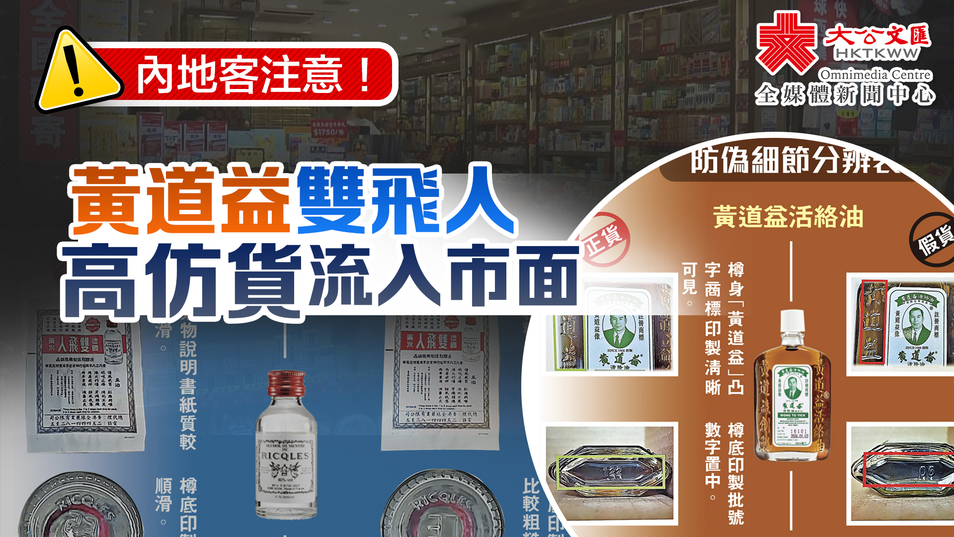 海關今次檢獲的冒牌貨品,除藥物和中成藥,還有潤膚品和防曬霜等,亦有著名化妝品SK II。陳溢龍表示,冒牌貨包裝及樽身仿真度極高,一般市民難辨真偽,但不法分子因應製作成本,在貨品說明書紙質、樽底紋路、商標清晰度及樽底批號數字等細節上處理較粗疏,以被偽冒的「雙飛人藥水」為例,每盒均有說明書,但紙質不同,正貨紙質光滑,假貨較粗糙;正貨樽底紋路順滑,假貨樽底紋路較粗糙。另外,「黃道益活絡油」正貨樽身商標清晰可見,假貨質素參差;正貨樽底印刷數字置中,假貨樽底印刷數字偏側。