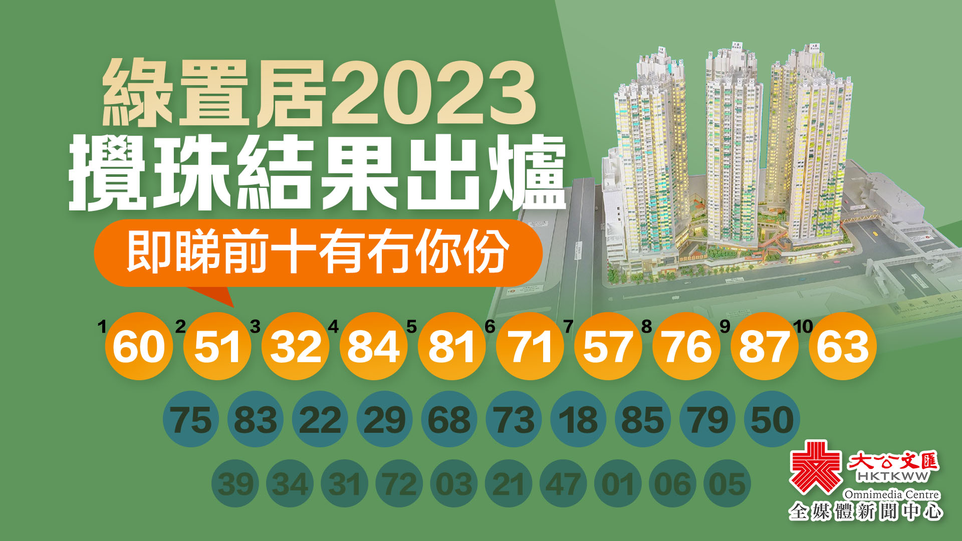 大公文匯全媒體報道,房委會「出售綠表置居計劃(綠置居)單位2023」的攪珠儀式今早(6日)10時半進行,以決定申請者按其申請編號最後兩個數字而訂的先後次序。首十個中籤號碼按序為60、51、32、84、81、71、57、76、87、63。