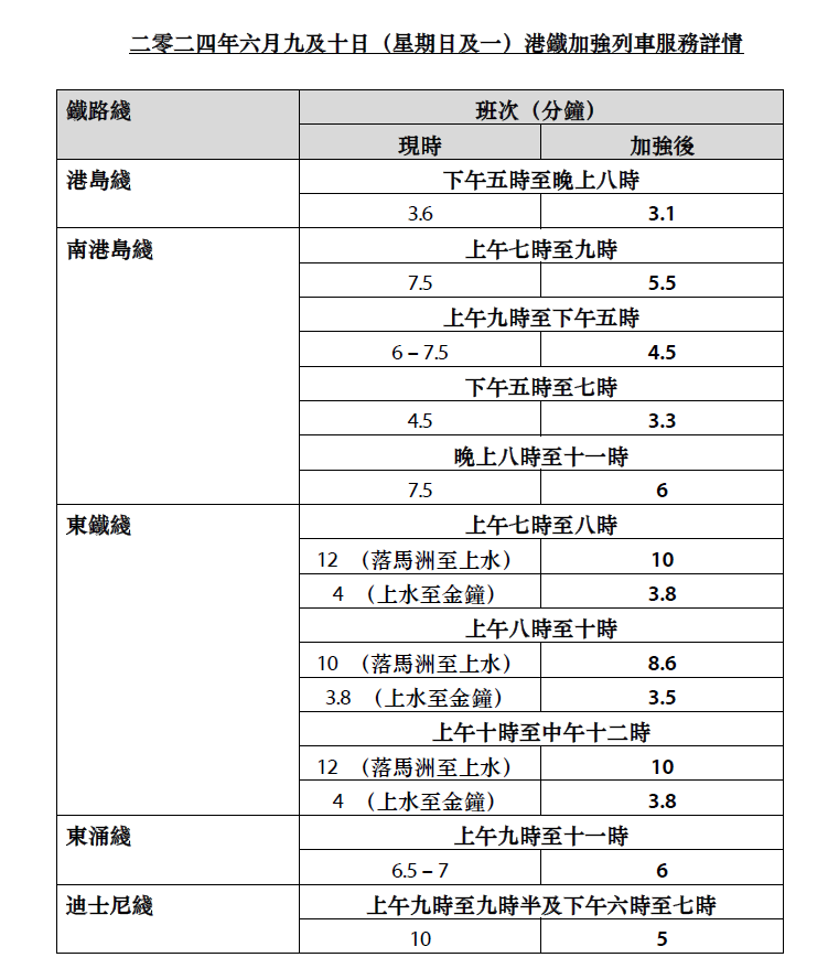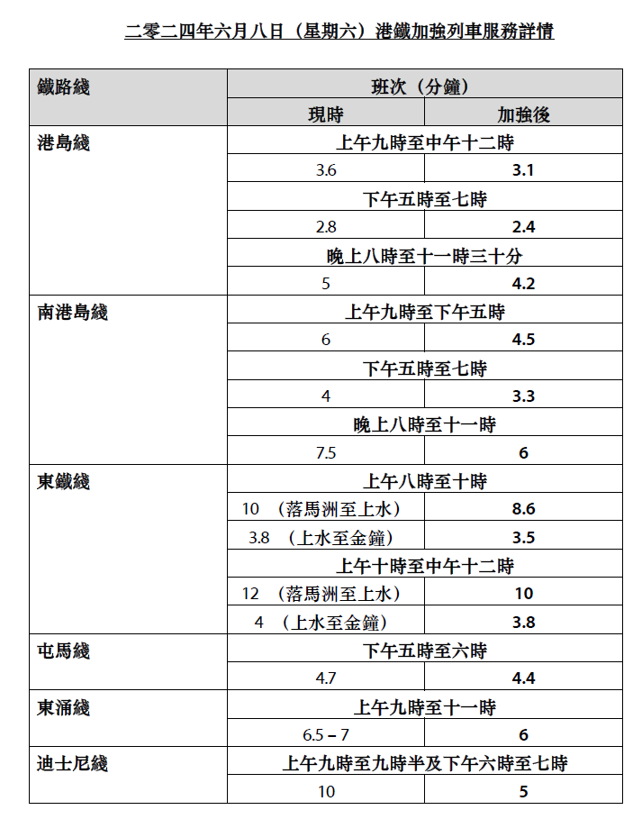 港鐵表示,港島綫將於本周六大部分時段以及其後兩天的下午至傍晚時段加密班次,由約3至5分鐘一班車,加密至約2分半至4分鐘一班車。南港島綫全日大部分時間的列車班次,均會加密至約3至6分鐘一班車,而迪士尼綫則在上午9時至9時30分,以及晚上6時至7時兩個時段,由10分鐘一班車加密至5分鐘一班車。東鐵綫方面,三日上午時段來往落馬洲至金鐘站的南、北行列車班次均會加密,包括往來落馬洲至上水站的班次,最頻密時約為8分半鐘一班車。