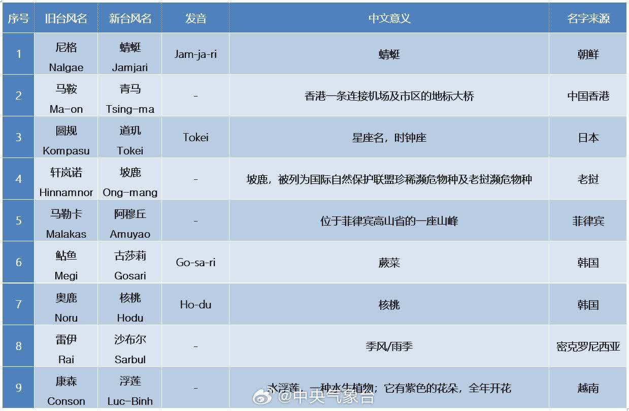 此次啟用的9個颱風新名字,中文譯名和意義由中國氣象局、澳門特別行政區政府地球物理氣象局、香港天文台和台灣地區氣象部門共同協商形成。具體情況如下: