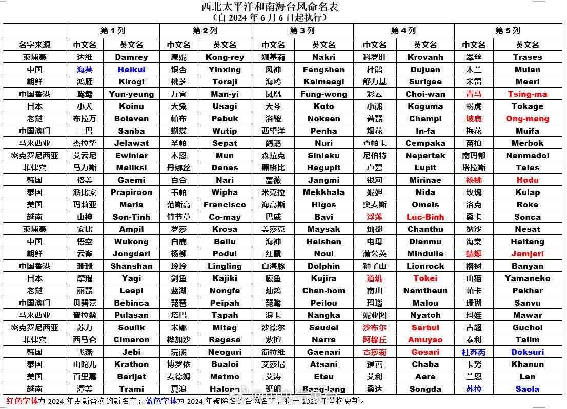 據央視新聞報道,從今天(6日)起,9個颱風新名稱將正式啟用。 根據2月27日至3月1日在馬來西亞吉隆坡舉行的聯合國亞洲及太平洋經濟社會委員會/世界氣象組織颱風委員會第56屆會議的決議,6月6日,「蜻蜓(Jamjari)」「青馬(Tsing-ma)」「道璣(Tokei)」「坡鹿(Ong-mang)」「阿穆丘(Amuyao)」「古莎莉(Gosari)」「核桃(Hodu)」「沙布爾(Sarbul)」和「浮蓮(Luc-Binh)」等9個颱風新名正式發布。