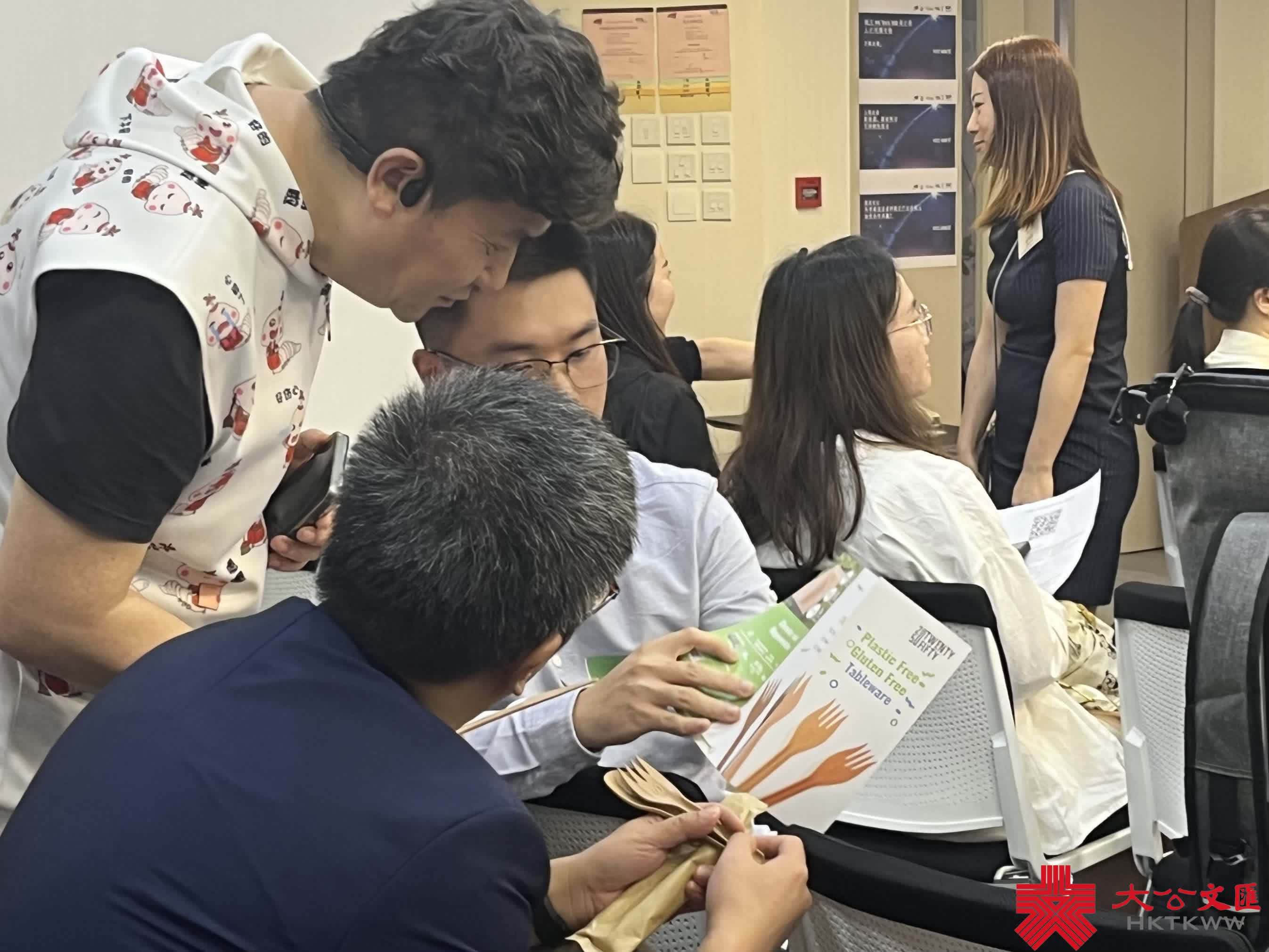 記者留意到在場一位參與者孔先生的項目可以說是完全緊跟現時熱點,他與哥哥的團隊研究了完全「零塑料」的一次性餐具。其與先前在市場上的一次性餐具不同,全由木材或竹筍製造,不需要含塑膠的黏合劑,讓產品更環保與健康。他表示,這個活動並不是簡單的配對企業與人才,更是搭建了雙方交流合作的平台。因為他的團隊在廣東清遠,今天透過自由交流環節找到與其志同道合的企業,考慮嘗試建立合作,打開香港市場。