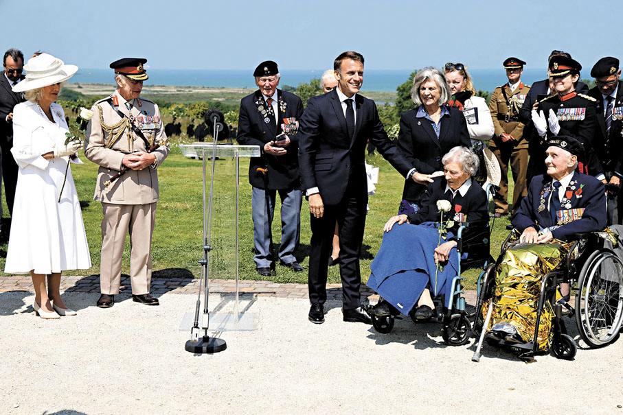 同日早上在阿羅芒什,有軍隊風笛手吹奏樂曲,紀念80年前首名英軍在諾曼底黃金海灘登陸。英國國王查爾斯三世與王后卡米拉、英國首相蘇納克,以及法國總統馬克龍夫婦抵達濱海韋爾,出席英國在當地舉辦的紀念活動。查爾斯三世致辭時,感謝當年軍人的付出,強調永遠不會忘記這段歷史,「讓我們期盼,這樣的犧牲不需要再發生。」