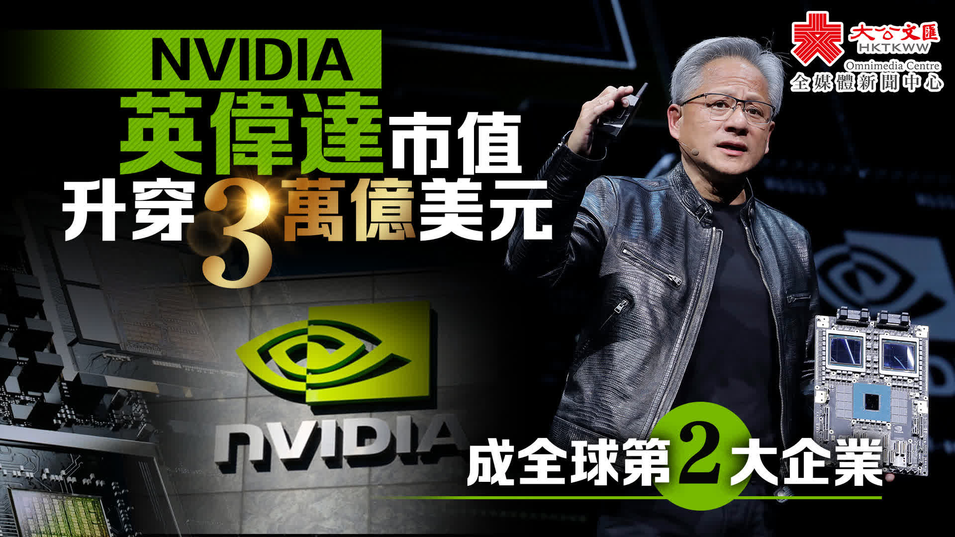 英偉達股價周三收市上漲5.2%,報1,224.40美元,成為全球歷來第三間市值突破3萬億美元(約23.4萬億港元)大關的企業。統計顯示,Nvidia市值於去年5月首次達到1萬億美元(約7.81萬億港元),今年2月突破2萬億美元(約15.6萬億港元)大關,現時又在短短3個月升穿3萬億美元。公司股價去年累計上漲約兩倍,今年也上漲一倍多。