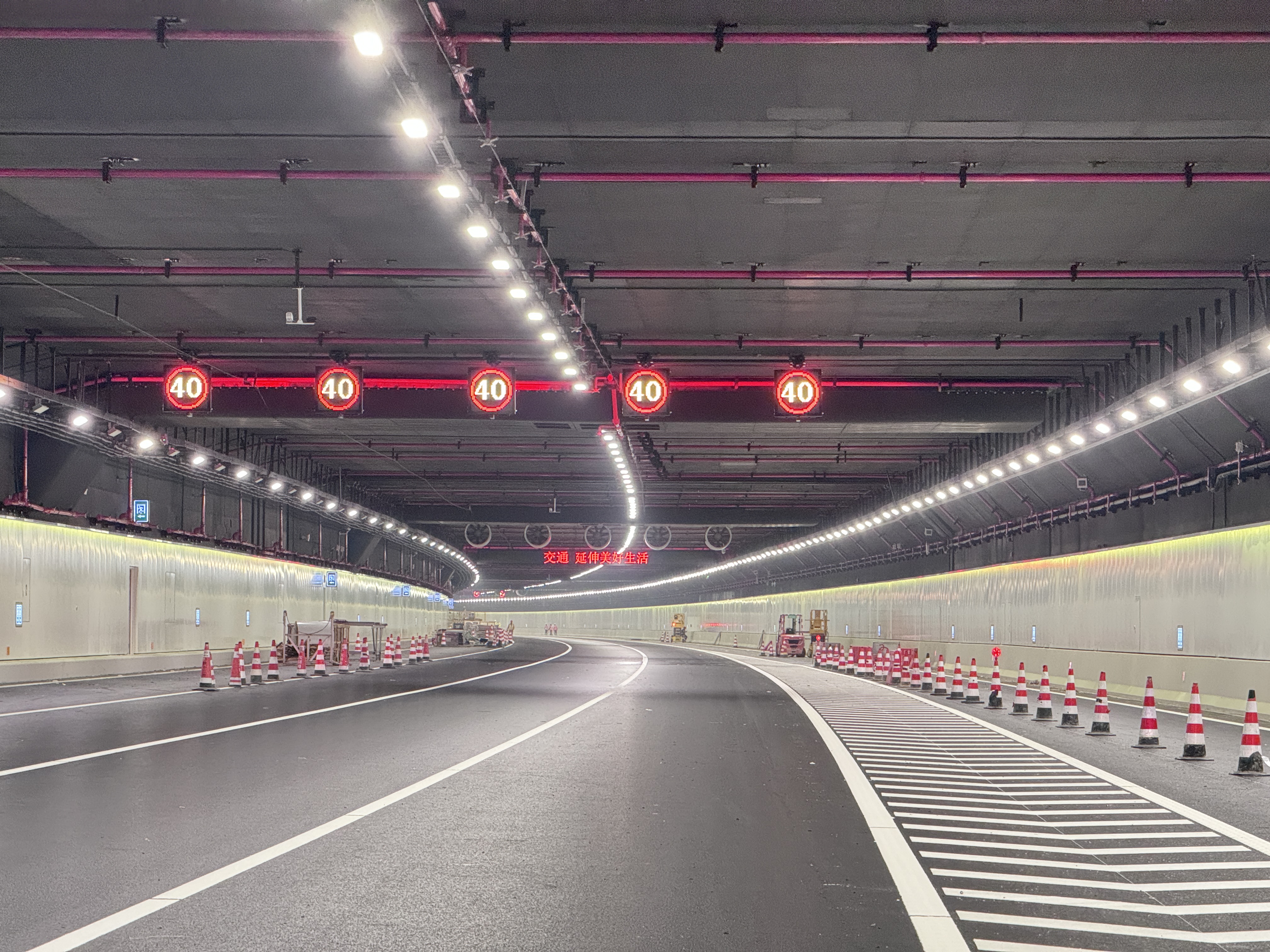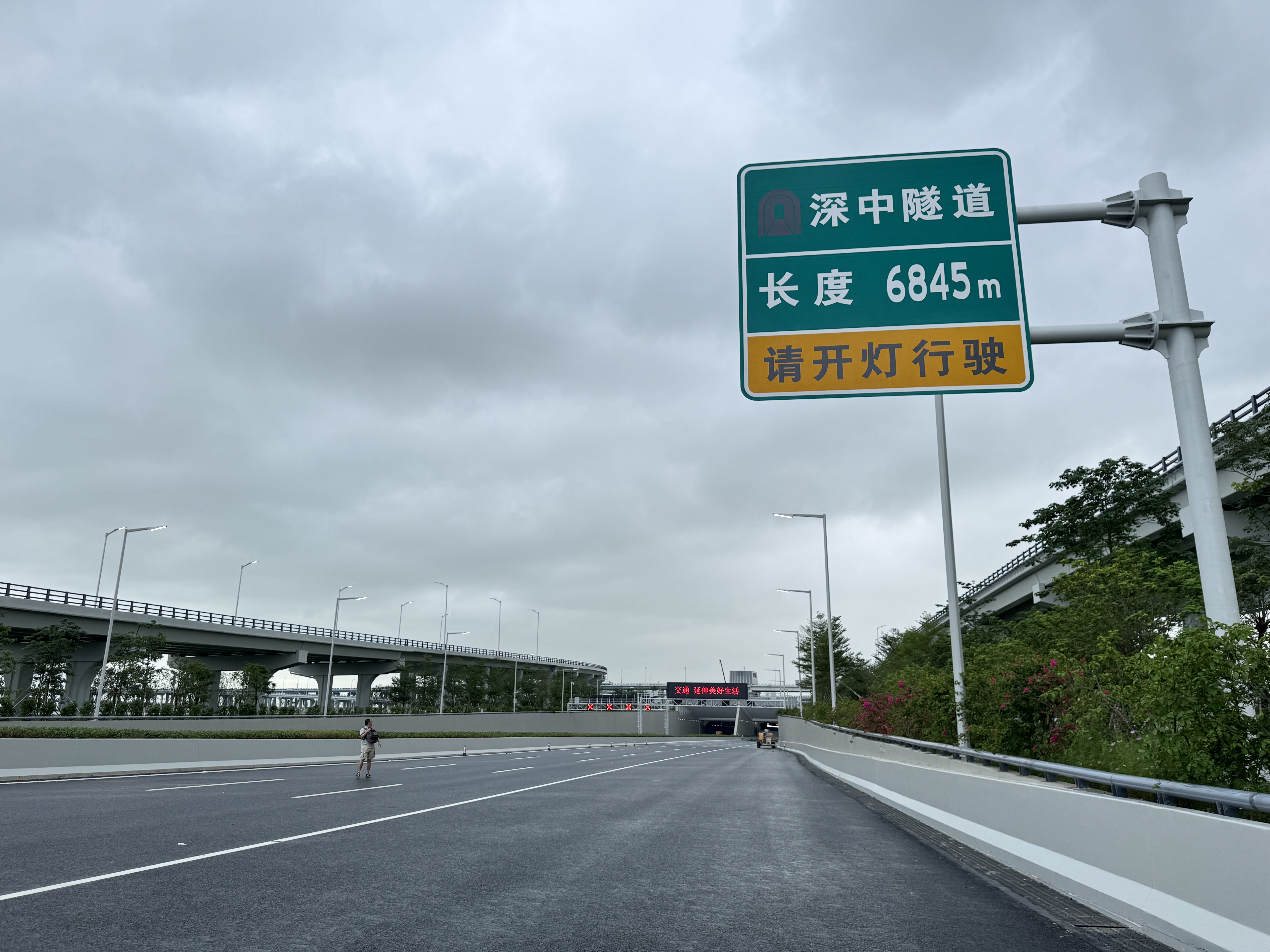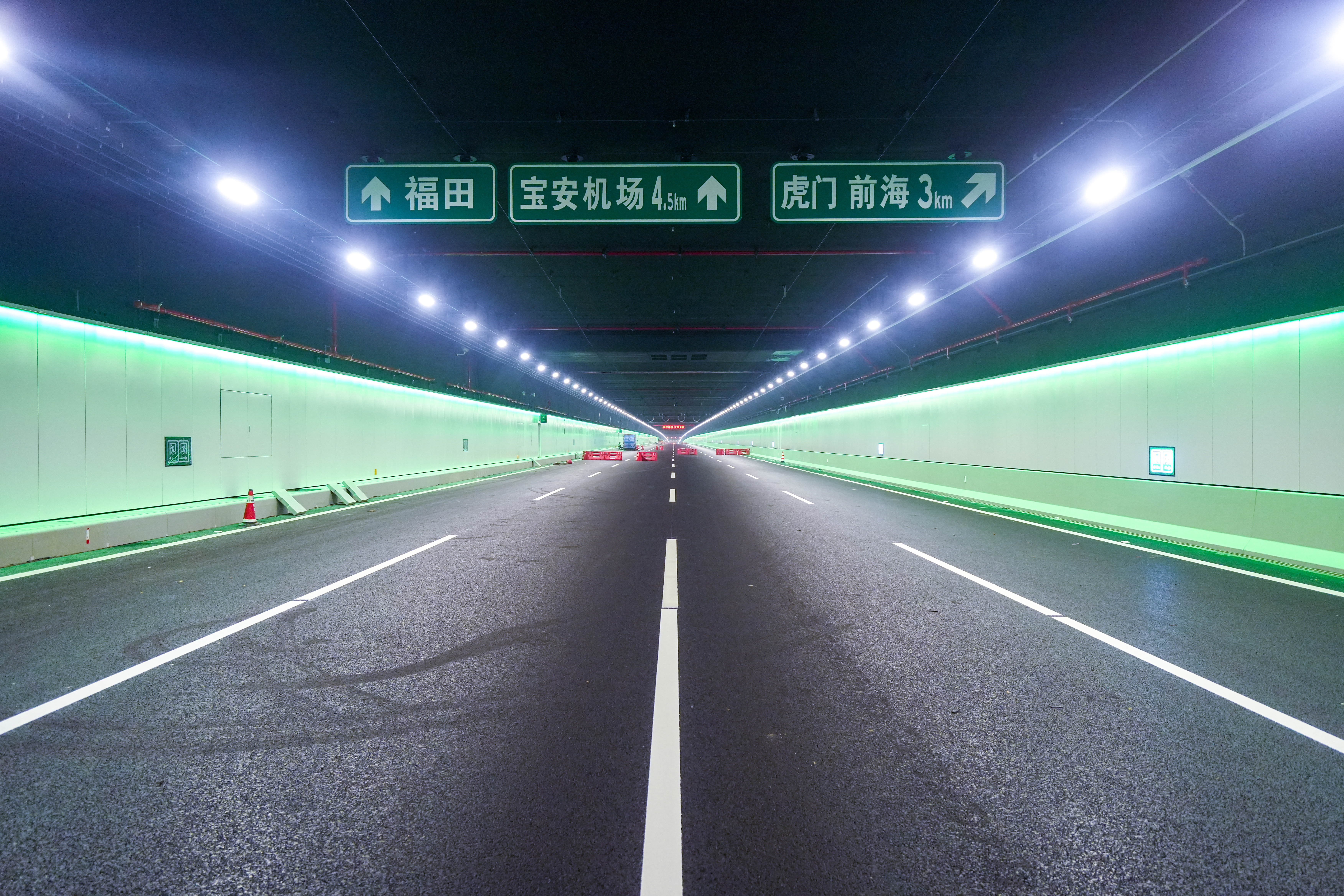 深中通道東人工島位於深圳寶安機場南側,全島陸域面積約34萬平方米,與深中隧道相連接,並實現與廣深沿江高速等路網的高效順暢銜接,為世界首座高速公路水下互通立交。北京交科設計院深中通道項目負責人霍潔告訴記者,沿東人工島主線向西行駛,便能進入長達6845米的深中隧道,打卡這一入選「全球隧道與地下工程領域50項標誌性工程」的地標建築。目前,隧道內燈光照明、可變情報板、交通標識,以及智能巡檢機器人等智能交通管控設施已安裝完畢。