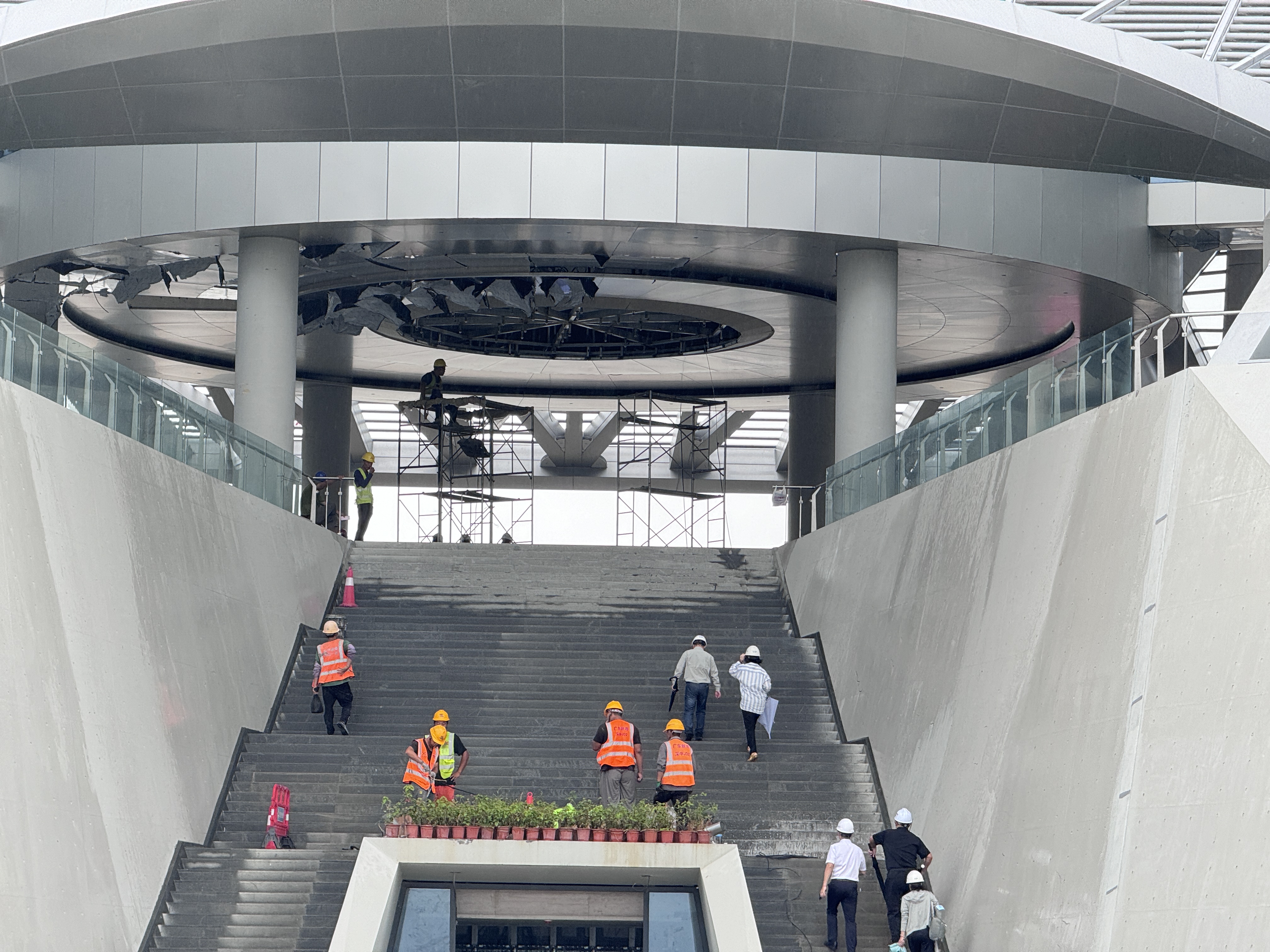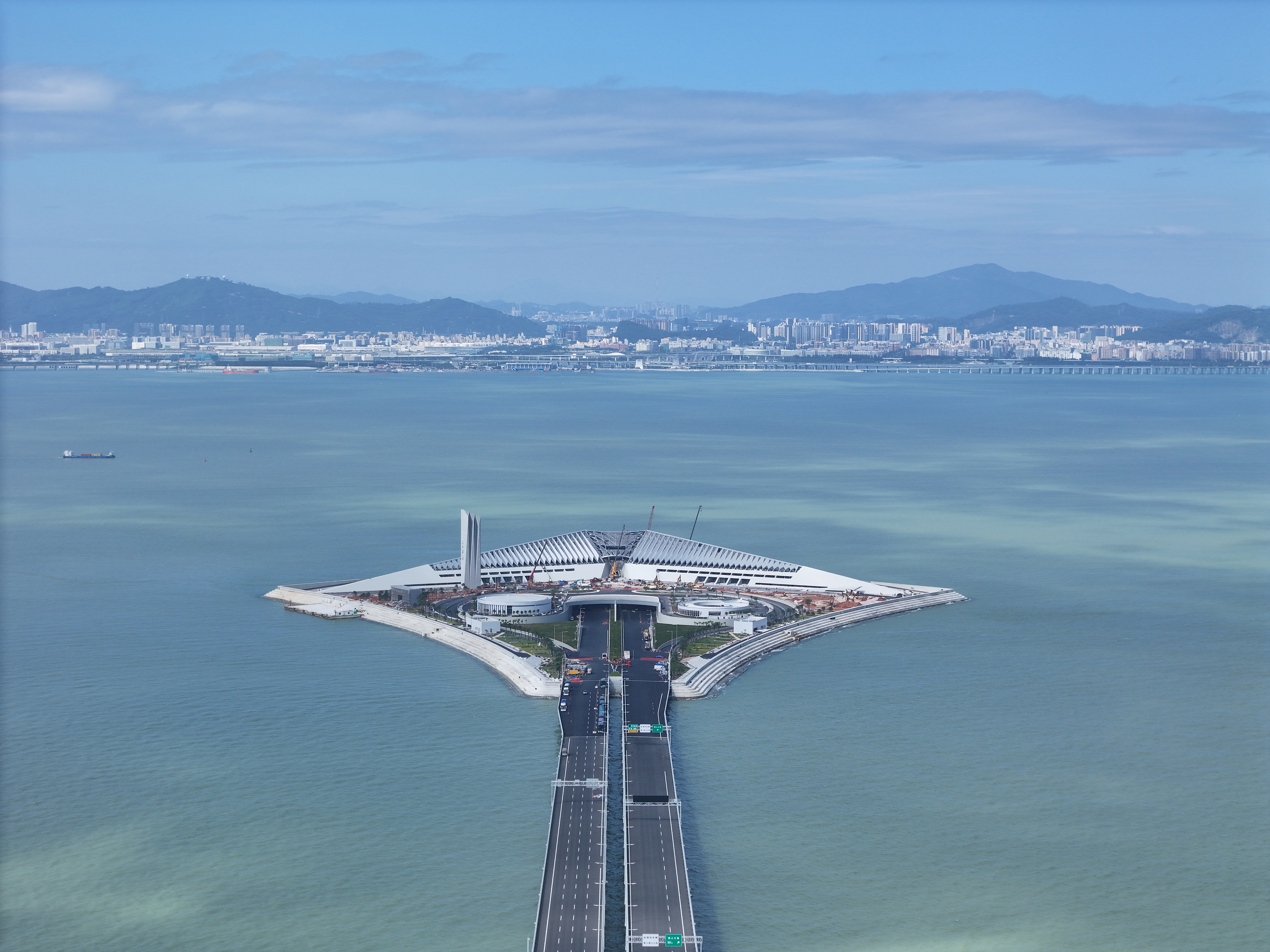 車輛駛出隧道後,便抵達橋樑隧道交通轉換的重要樞紐——造型如鯤鵬展翅的西人工島。西人工島上迎海而立的主樓棕櫚葉般的幕牆引人注目,外立面的清水混凝土顏色簡潔素雅,採用鏤空結構實現通風與遮陽,不僅提高了使用舒適性,還能降低建築能耗。未來這裏將作為深中通道的科普教育基地和辦公場所。深中通道管理中心副主任馬二順表示,深中通道房建工程已進入收尾階段,位於主樓左翼的科普教育基地正在加緊建設。「通車後,社會車輛不能隨意進入西人工島。待科普教育基地建成後,我們將及時發布預約參觀方式。」