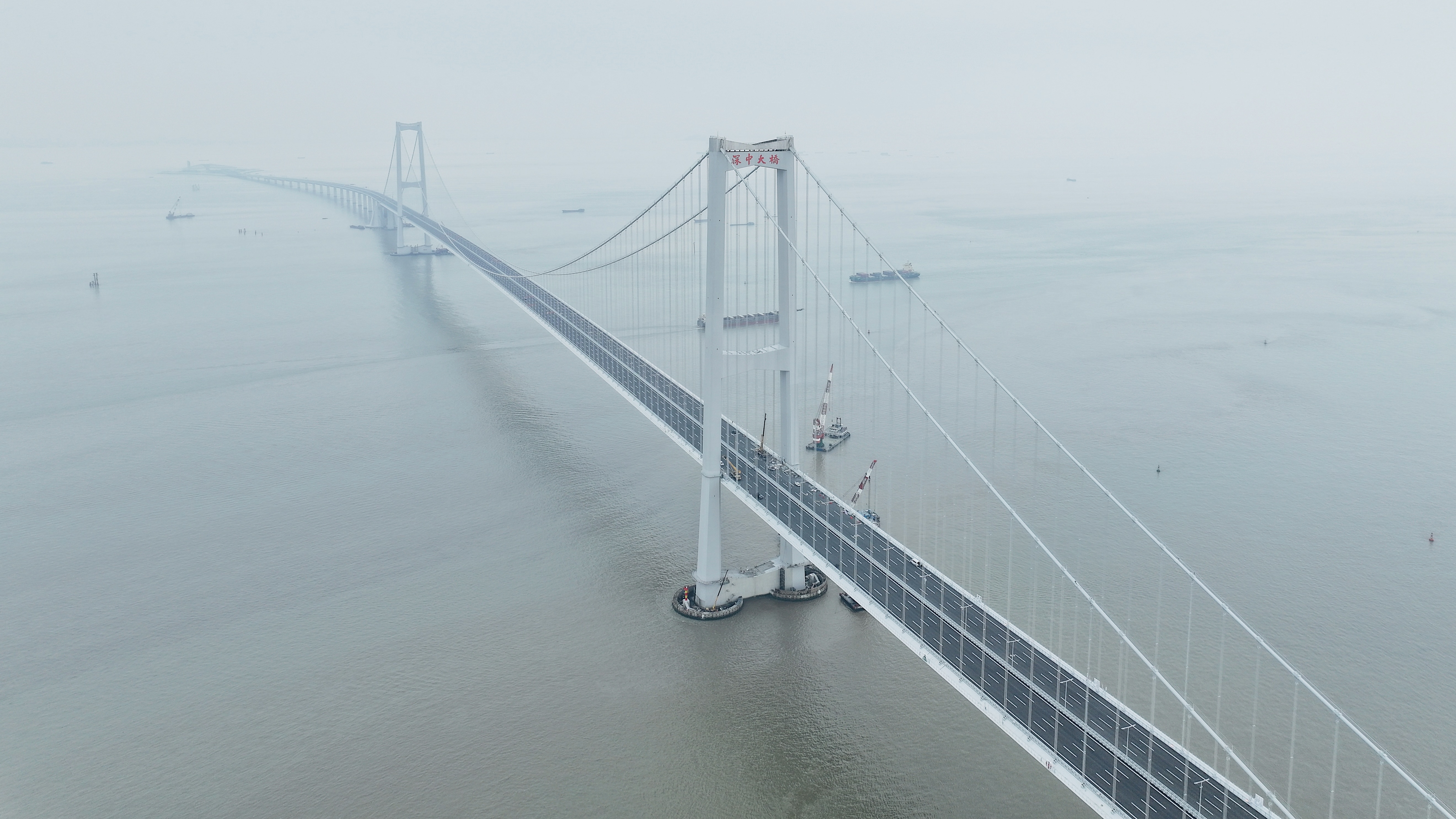 駛離西人工島,記者透過雨簾,看到了朦朧氤氳中依然氣勢恢宏、美輪美奐的世界最大跨徑全離岸海中鋼箱梁懸索橋——深中大橋(原伶仃洋大橋),目之所及,可變情報板、路牌、路燈、護欄、地面標識已全部安裝完成,270米高的橋塔橫樑上,「深中大橋」四個大字隱約可見。