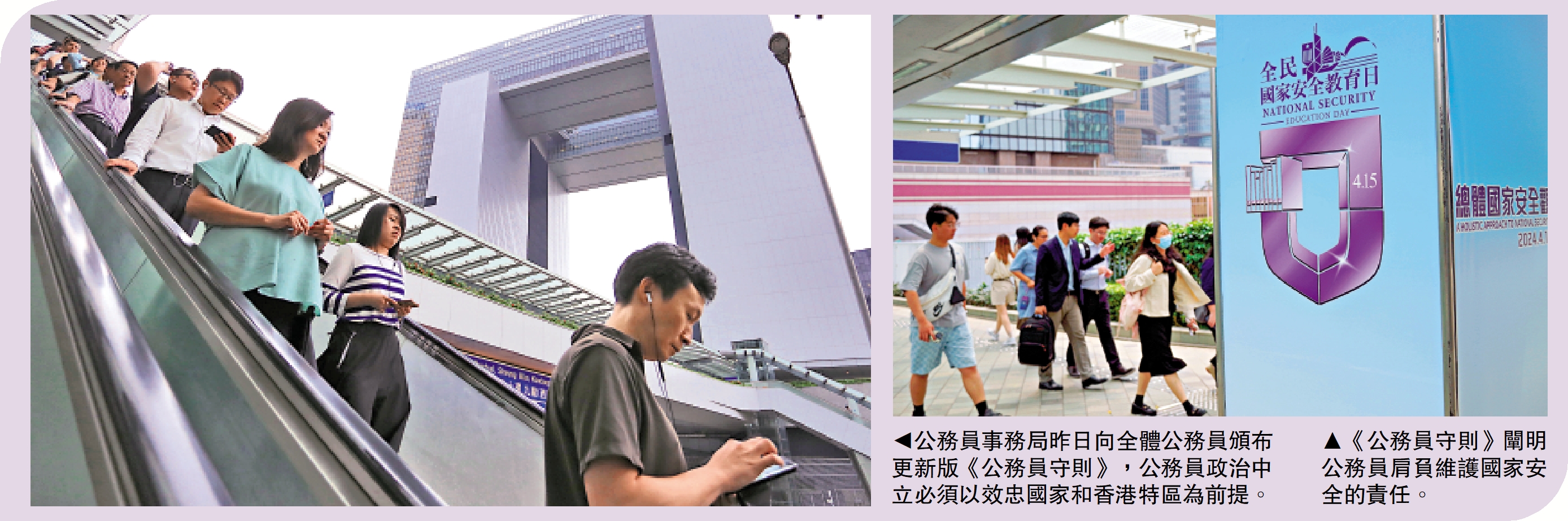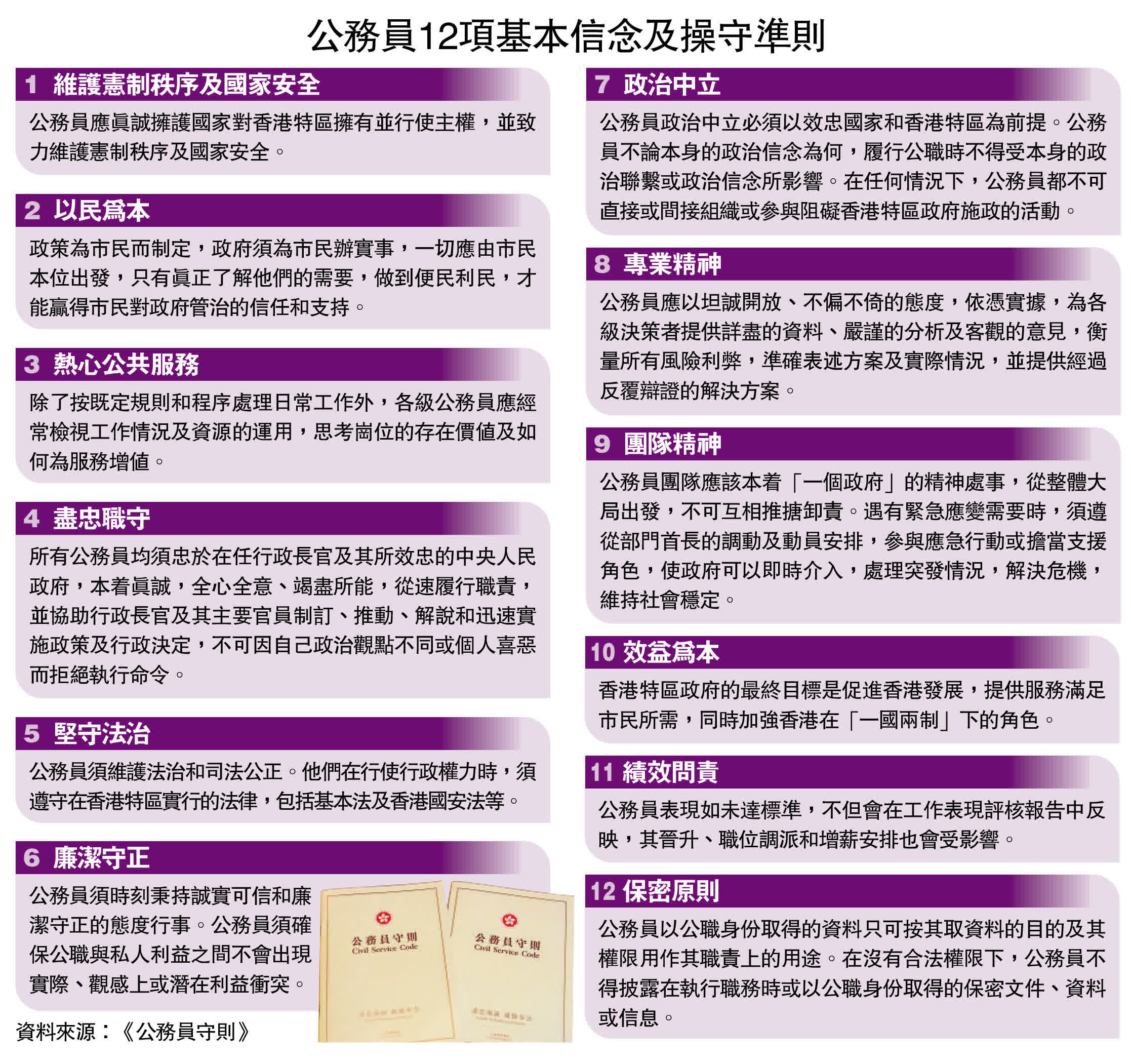 (大公報 記者 龔學鳴)公務員事務局昨日向全體公務員發出通告,頒布更新版《公務員守則》,闡明香港特別行政區的憲制秩序、公務員作為行政機關一員的憲制角色和責任,以及公務員應有的基本信念和操守準則。公務員事務局局長楊何蓓茵表示,因應維護國家安全條例在今年3月生效,局方也將有關的部分在更新版守則中加以闡述。