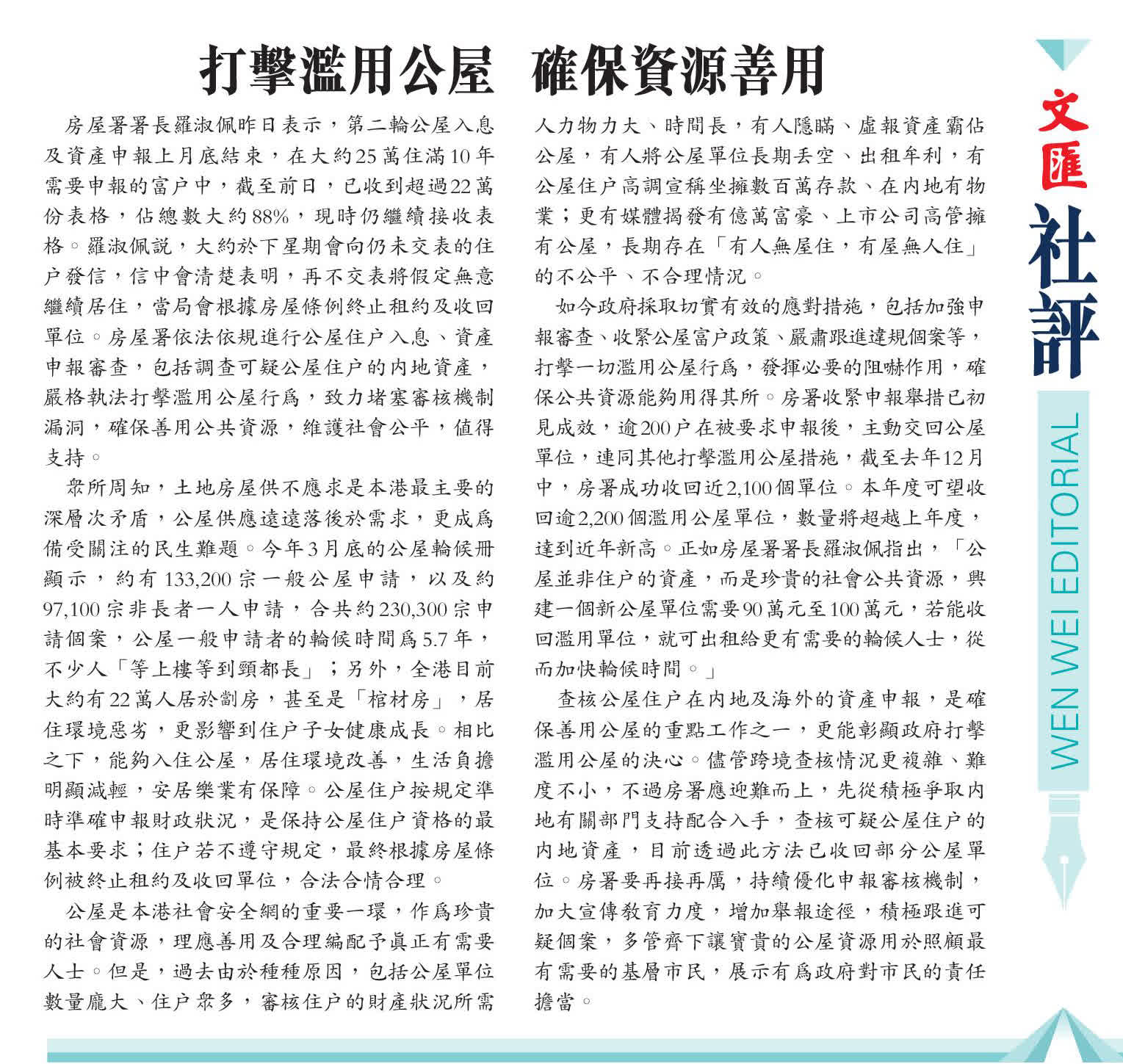 查核公屋住戶在內地及海外的資產申報,是確保善用公屋的重點工作之一,更能彰顯政府打擊濫用公屋的決心。儘管跨境查核情況更複雜、難度不小,不過房署應迎難而上,先從積極爭取內地有關部門支持配合入手,查核可疑公屋住戶的內地資產,目前透過此方法已收回部分公屋單位。房署要再接再厲,持續優化申報審核機制,加大宣傳教育力度,增加舉報途徑,積極跟進可疑個案,多管齊下讓寶貴的公屋資源用於照顧最有需要的基層市民,展示有為政府對市民的責任擔當。