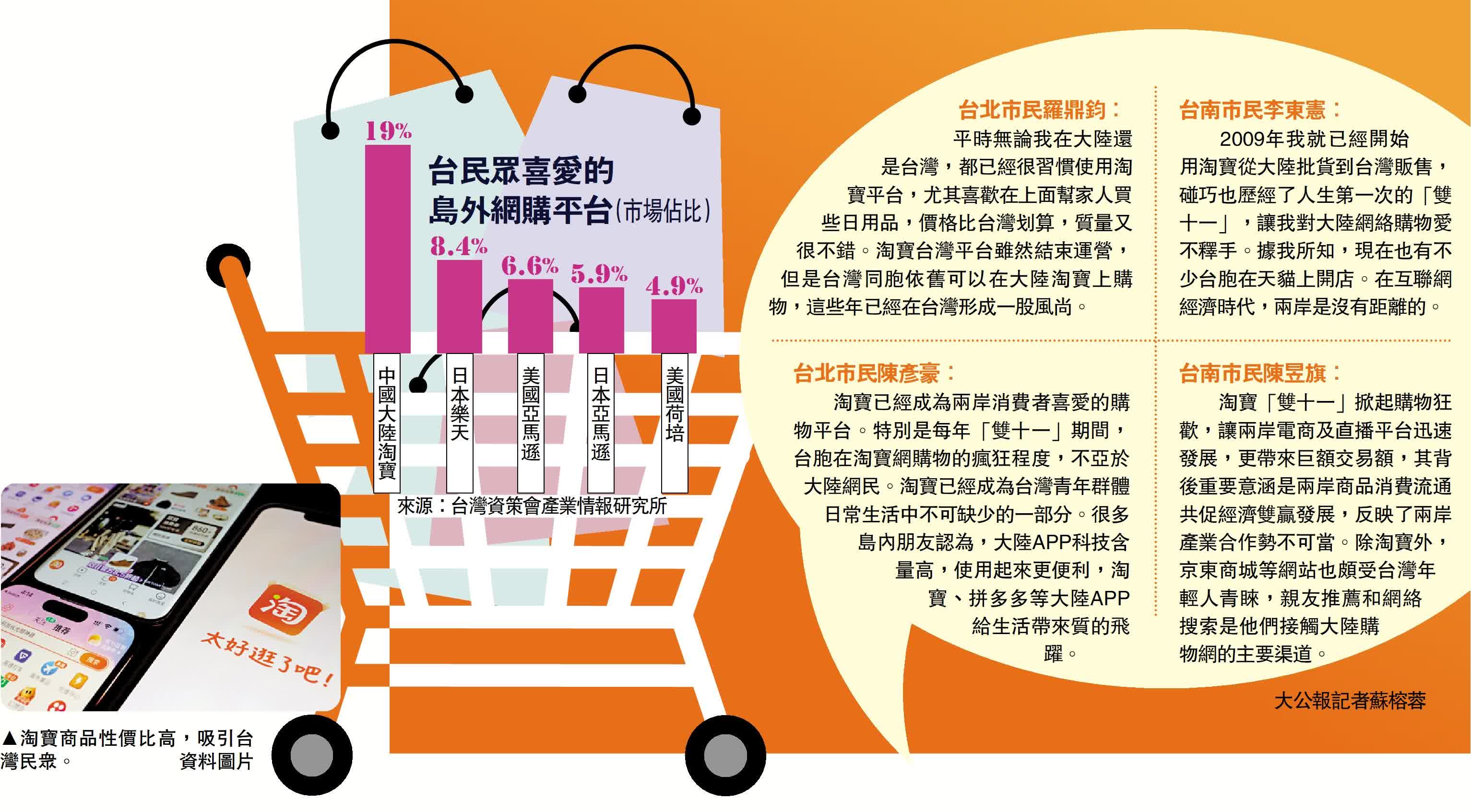 大公報報道,大陸跨境電商近年來持續火熱,天貓淘寶海外台灣總經理劉慧娟日前表示,香港、澳門和台灣地區以及海外上淘寶購物,以台灣地區的市場貢獻最大,尤其在新加坡、馬來西亞、澳洲、中國香港、中國澳門等,台灣地區市場增長最快、市佔率最高。島內有報告顯示,淘寶及天貓是台灣民眾在境外平台消費行為第一名。有台灣年輕人表示,平均每個月都要在淘寶上花2000多新台幣(約480港元),淘寶平台的商品性價比高,而且很快就收到貨,使用淘寶購物在台灣年輕一代中已成為一種潮流。